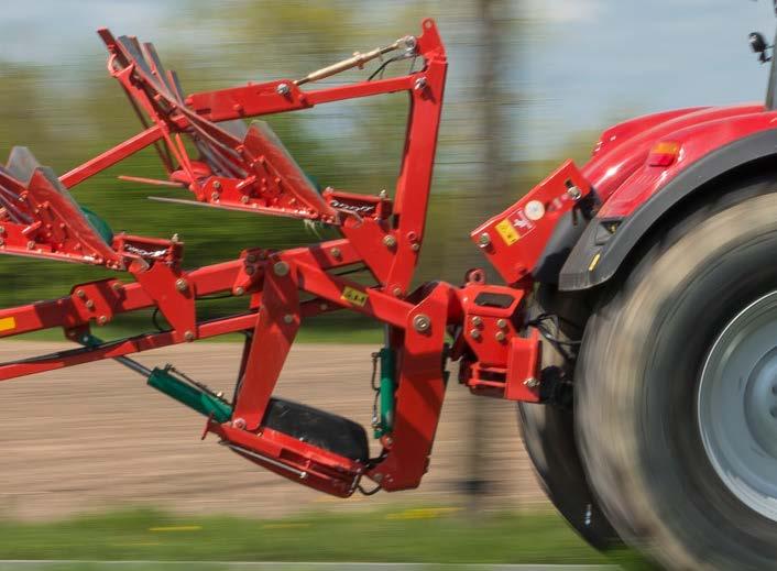 Quick and easy. One can change the plough position from transport to ploughing and vice versa from the tractor cabin. The top link of the tractor remains connected during transport thanks to the hinged headstock. The pivot point of tractor/plough is located in the middle. No further adjustements are necessary for the ploughing position.