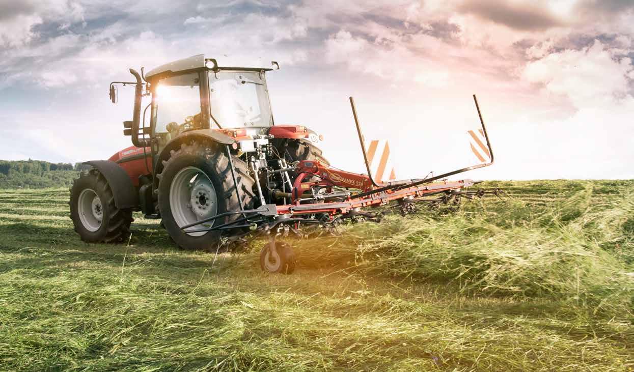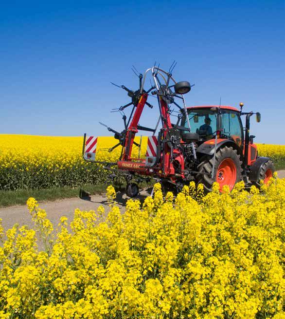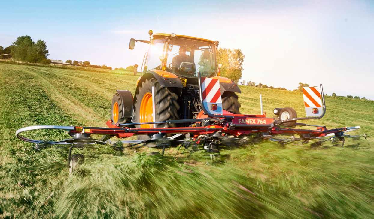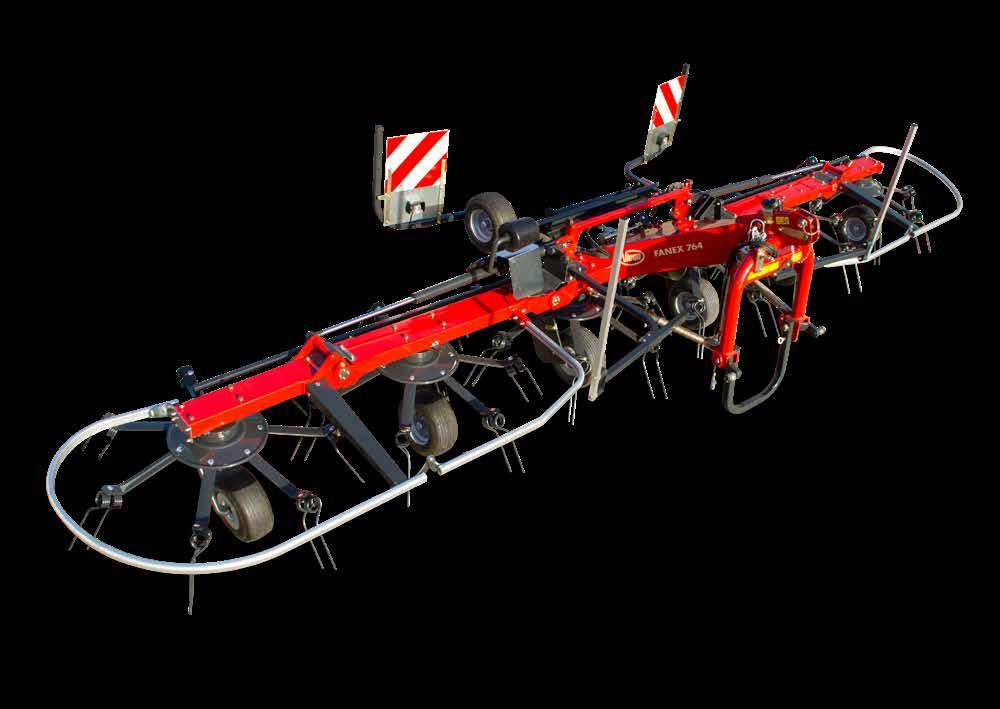 The carrier frame concept of a Fanex 904C and 1124C allows to be managed with smaller tractors than conventional sizes. These two models offer very compact storage and transport height due to the implementation of the HexaLink finger clutch system in the joints of the two outer rotors.