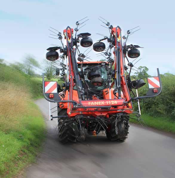 “ New folding mechanism – even weight distribution”Compact transport dimensions of Fanex 1124 – storage height is only 3.80m. New folding mechanism – ensures even weight distribution during the complete folding sequence. With the optional electro-hydraulic headland kit with pilotbox, the machine can be raised while on headlands using the hydraulic control device.