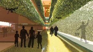 Located steps away from the historic Black Broadway on U Street, the DC Library of Performing Arts doubles as a library that has a collection with an emphasis on artistic pieces of work produced by Black/ African American creators as well as an outdoor performance space that can be seen from multiple points from both inside and outside the library. Within the library there is a cafe overlooking the performance area, as well as a children's library, classrooms, and video and sound recording studios for future creators. The facade is split into two sections to represent the old and the new architectural styles of the surrounding area, and the louvers on the front facade correlate with the pattern of a music staff.