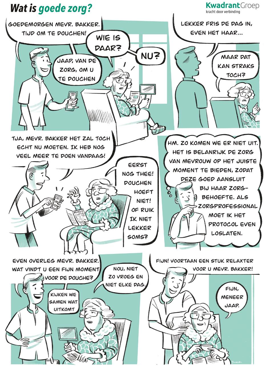 Kwaliteit wordt gemaakt door de (zorg)medewerkers en de cliënt of bewoner. Wat goede kwaliteit van zorg is, wordt bepaald door landelijke normen zoals het nieuwe Kwaliteitskompas (voorheen Kwaliteitskaders), richtlijnen en protocollen, en ook vanuit de wensen van de teams en de cliënt. Maar wat goed is voor de cliënt, is dat ook goed voor de organisatie en de medewerker en andersom?