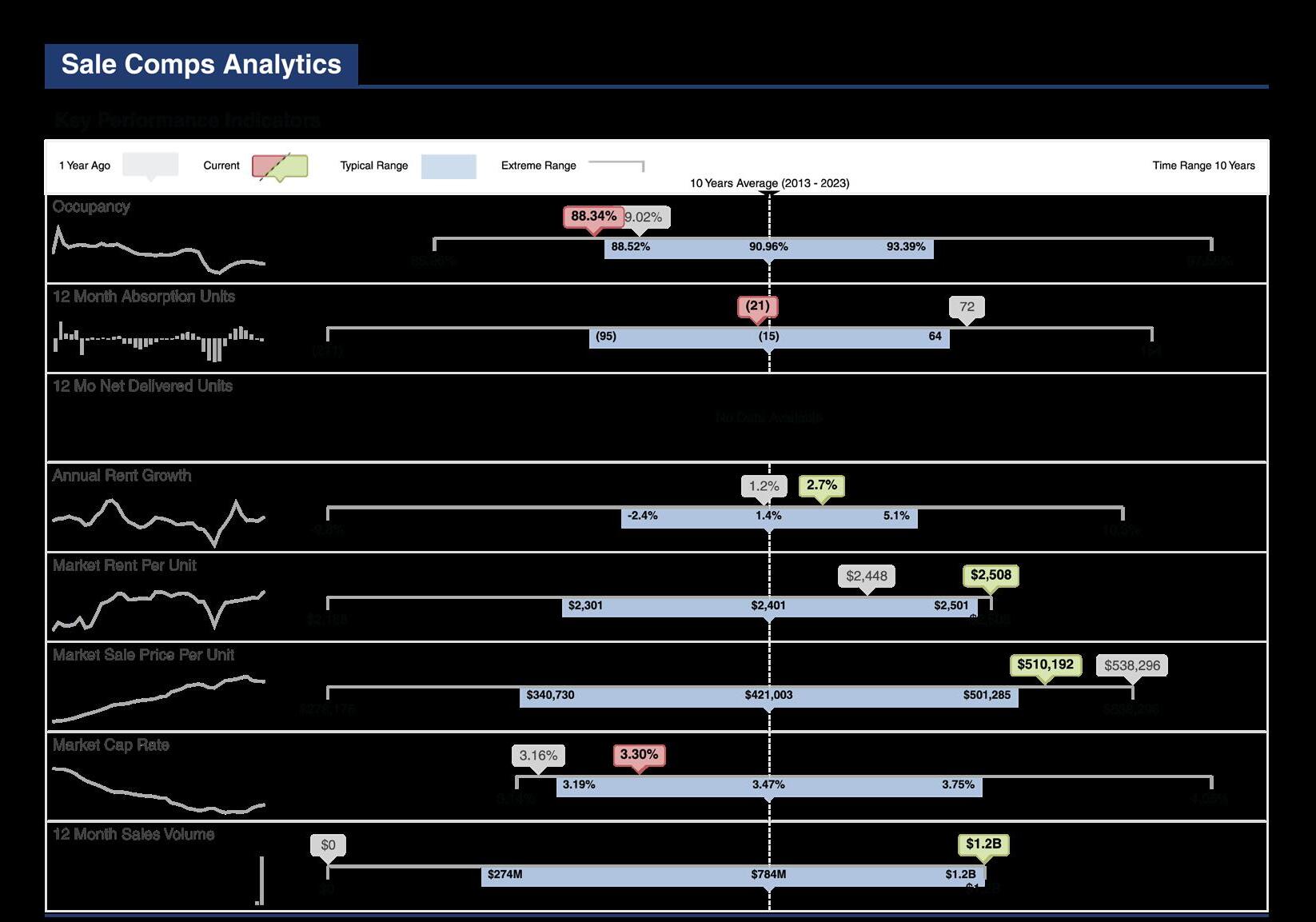 Sales Price $20,000,000 Bldg. SF 25,854 $/SF $774 $/Unit $666,667 Units 30 Sold Date Apr-23 Vacancy 0.7% Sales Price $12,000,000 Bldg. SF 25,668 $/SF $468 $/Unit $500,000 Units 24 Sold Date Feb-23 Vacancy 4.90% Sales Price $24,035,500 Bldg. SF 34,360 $/SF $700 $/Unit $471,284 Units 51 Sold Date Mar-23 Vacancy 53.90% Sales Price $22,500,000 Bldg. SF 51,718 $/SF $435 $/Unit $288,462 Units 78 Sold Date Dec-22 Vacancy 0.50%
