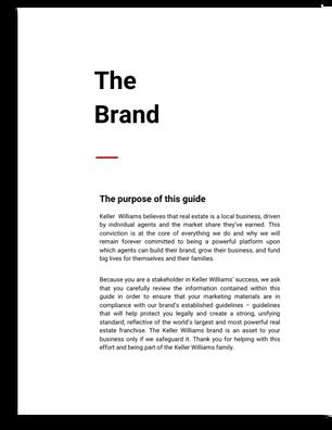 BecauseyouareastakeholderinKellerWilliams’success,weask that you carefully review the information contained within this guide to ensure that your marketing materials comply with our brand’s established guidelines – guidelines that will help protect youlegallyandcreateastrong,unifyingstandard;reflectiveofthe world’s largest and most powerful real estate franchise. The Keller Williams brand is an asset to your business only if we safeguard it. Thank you for helping with this effort and being part oftheKellerWilliamsfamily.