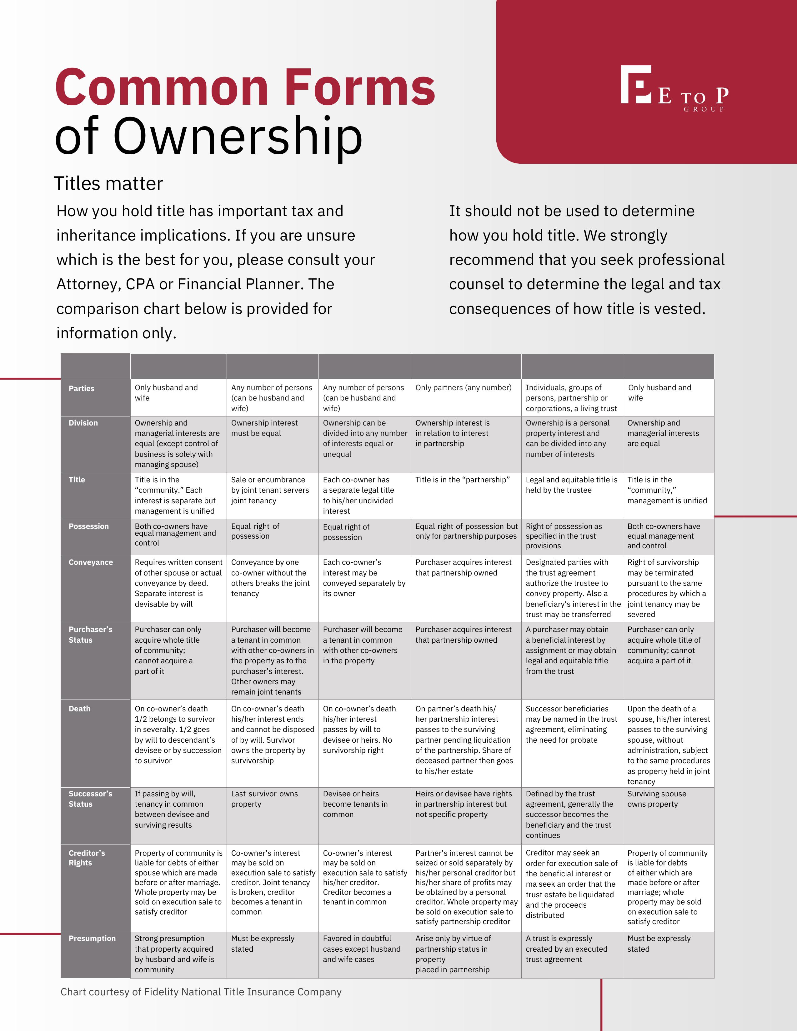 How you hold title has important tax and inheritance implications If you are unsure which is the best for you, please consult your Attorney, CPA or Financial Planner The comparison chart below is provided for information only.