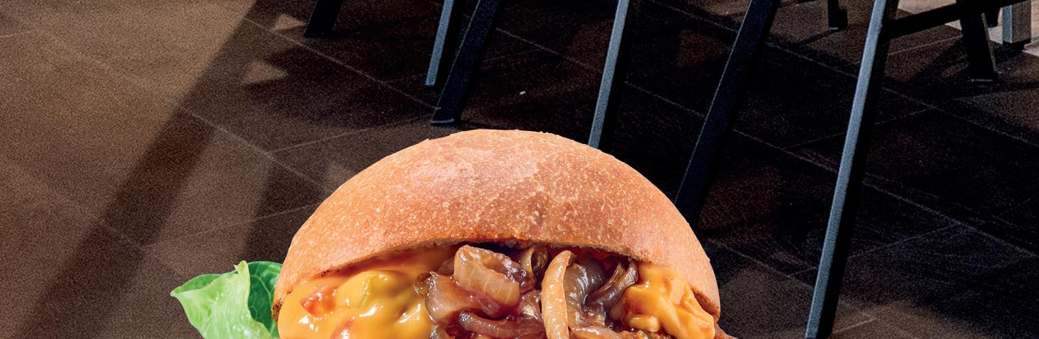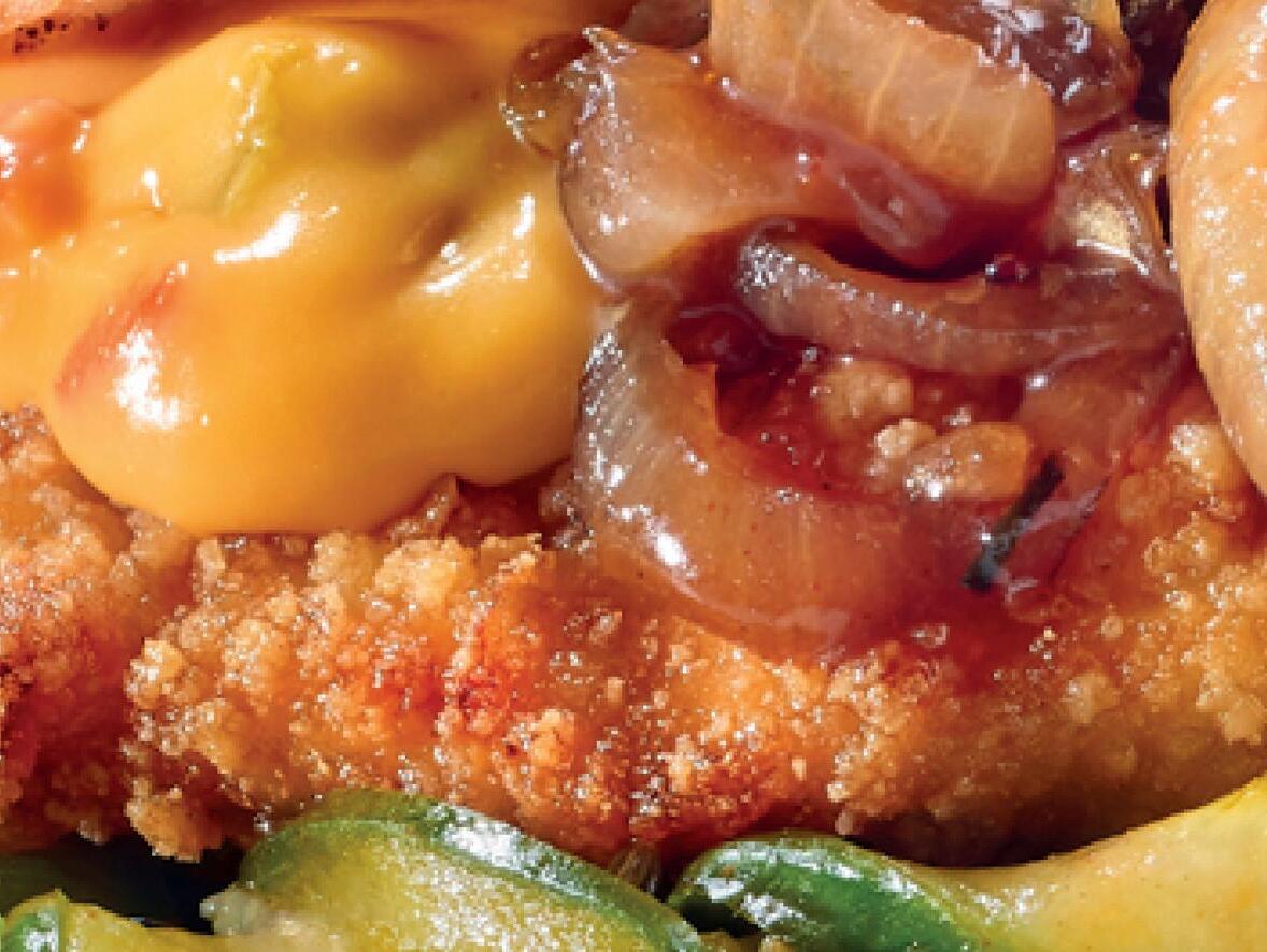 7. Verdeel de gekarameliseerde ui over de kipburger.