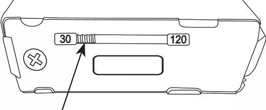The magazine included with each M1O has an adjustable capacity of 30 or 120 rounds.To switch the magazine capacity, first make sure the magazine is completely empty. Then,switch thelever on the bottom of the MS120c magazine to the desired capacity as shown.