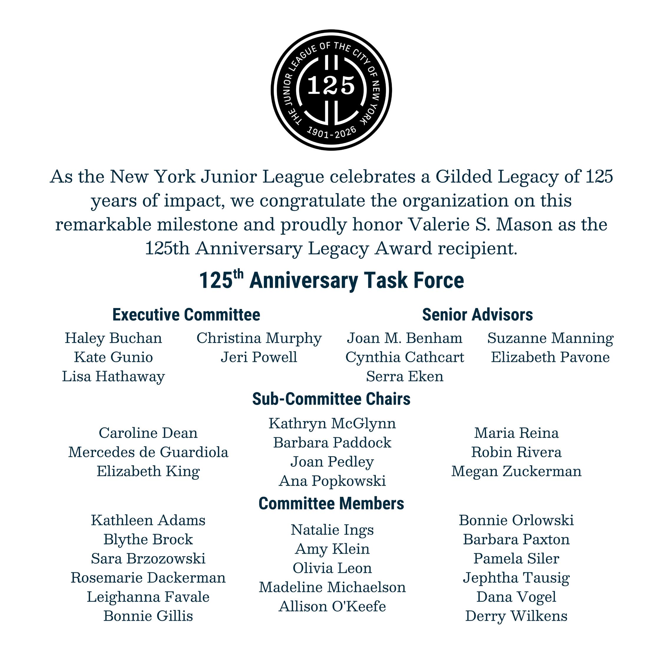 As the New York Junior League celebrates its 125th anniversary, it is fitting to honor a woman whose life’s work embodies the enduring mission of the organization. Valerie S. Mason’s leadership — grounded in integrity, service, and purpose — serves as an inspiration for generations of women leaders to come.