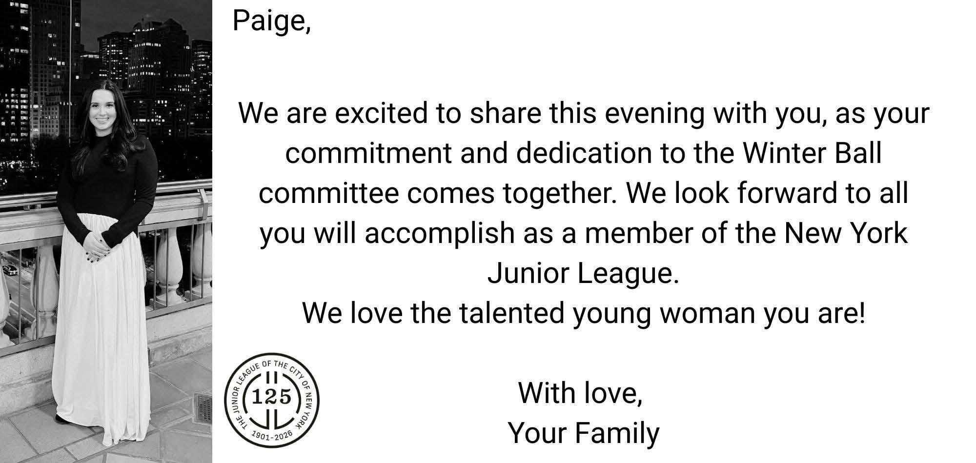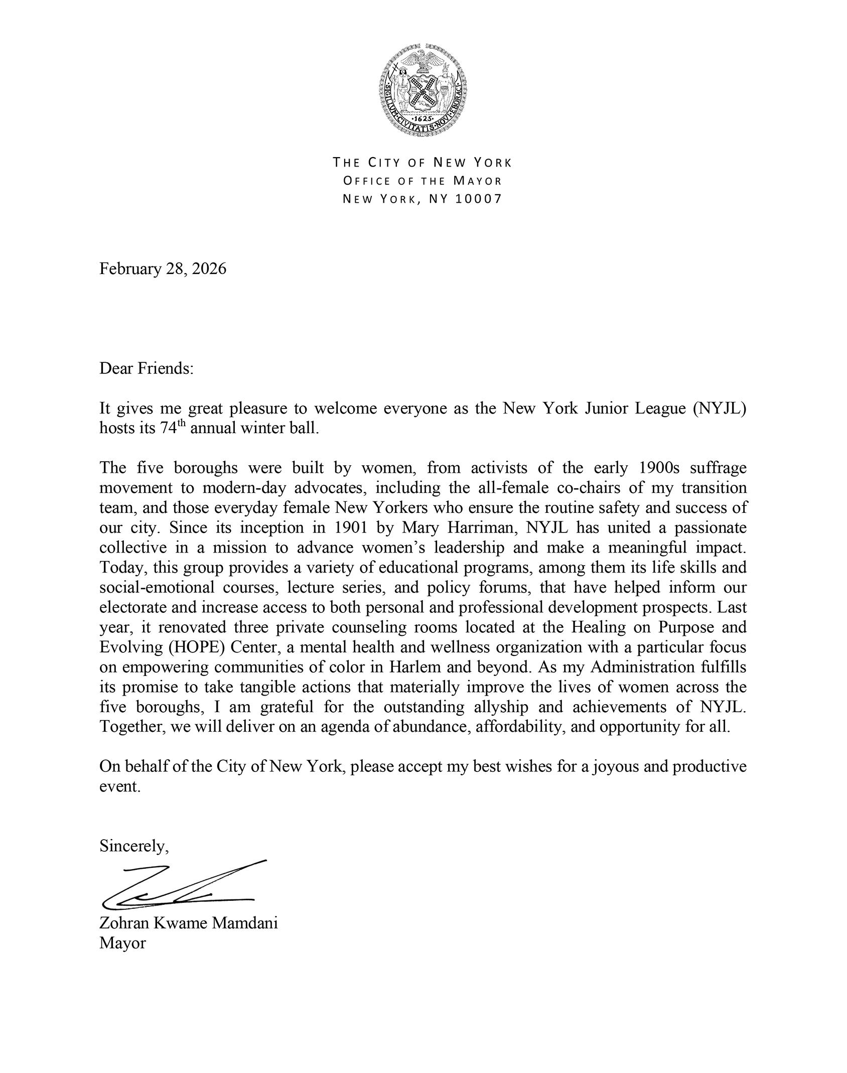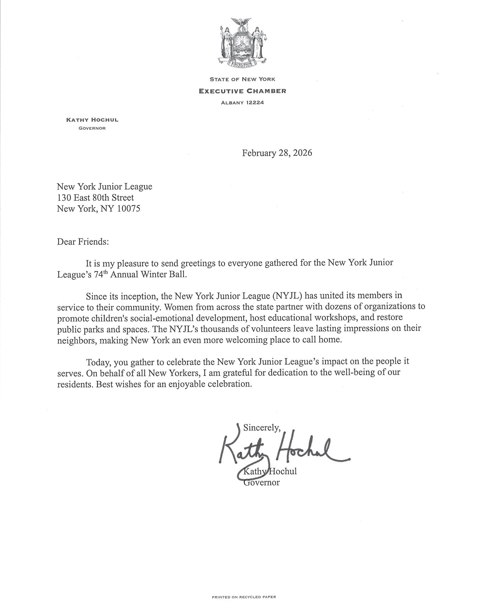 Welcome to the 74th Annual Winter Ball, “Gilded Legacy: Celebrating 125 Years of Impact,” hosted by the New York Junior League (NYJL)! Thank you for joining us during this truly historic moment as we celebrate our 125th Anniversary Year. This evening is both a celebration and a reflection—honoring a remarkable legacy of service while recommitting ourselves to the work ahead. We are delighted to gather with you to celebrate the enduring spirit of volunteerism and to raise critical support for the NYJL’s charitable mission.