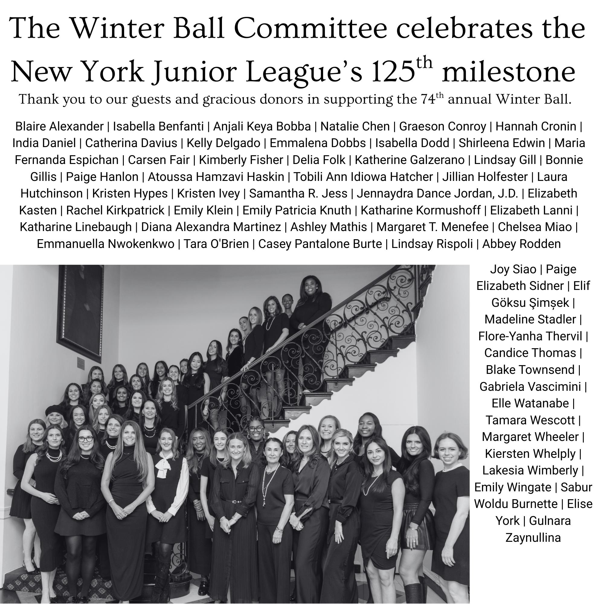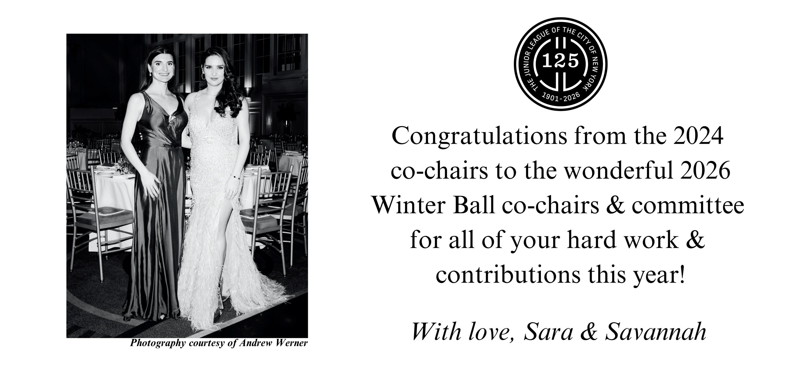 We extend our deepest gratitude to our exceptional co-chairs for their outstanding leadership of the New York Junior League’s 74 annual Winter Ball. Your dedication, vision, and tireless efforts transformed this milestone event into an unforgettable evening. We are truly fortunate to have worked alongside such passionate leaders. th