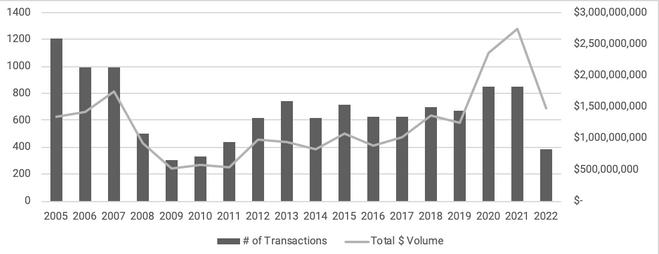 The vacant land segment of the market incurred the largest drop in transactions, down 70% compared to 2021. The total dollar volume dropped over 60% compared to 2021 and is on par with the volume seen in 2019. Thanks to several ultra-high-dollar land sales, the average and median sale prices experienced robust increases, up 28% and 13% respectively. Inventory for vacant land increased modestly, up about 20% from the previous year.