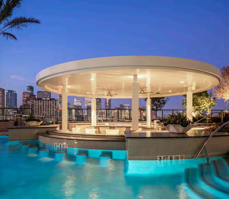 mixed-use community // 380 units // podium-level resort-style pool deck with tanning ledge // outdoor kitchen area // lush landscape with palms // open green space with seating areas // podium-level dog park // shade structures // outdoor fire pits