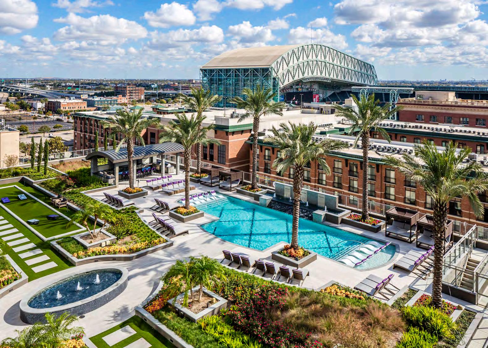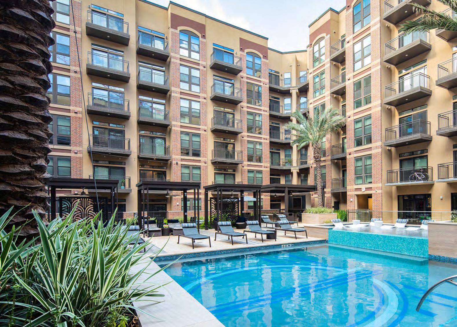 The Catalyst is situated just a block away from Minute Maid Park in Downtown Houston, offering a prime location in the heart of the city. Standing 28-stories tall and with the 9th story amenity deck spanning 20,000 SF, our outdoor-designed amenities include 2 podium-level luxurious pools showcase inviting water features, exclusive cabanas for private relaxation, comfortable outdoor seating and lounge areas, shaded structures for comfort, a fully equipped outdoor kitchen with grilling stations for social gatherings, a cozy fire pit for evening ambiance, and even a sand volleyball court for active recreation.