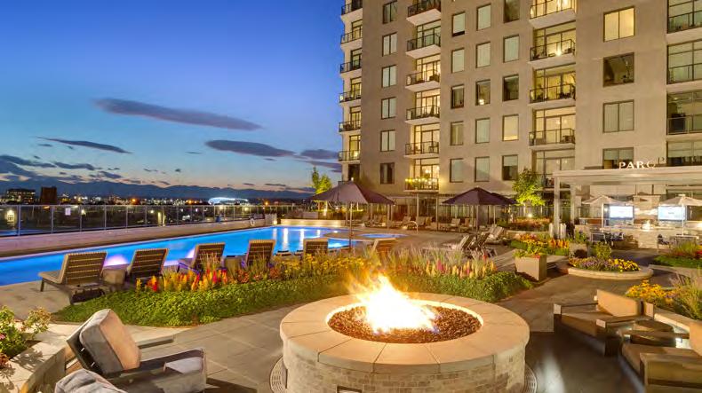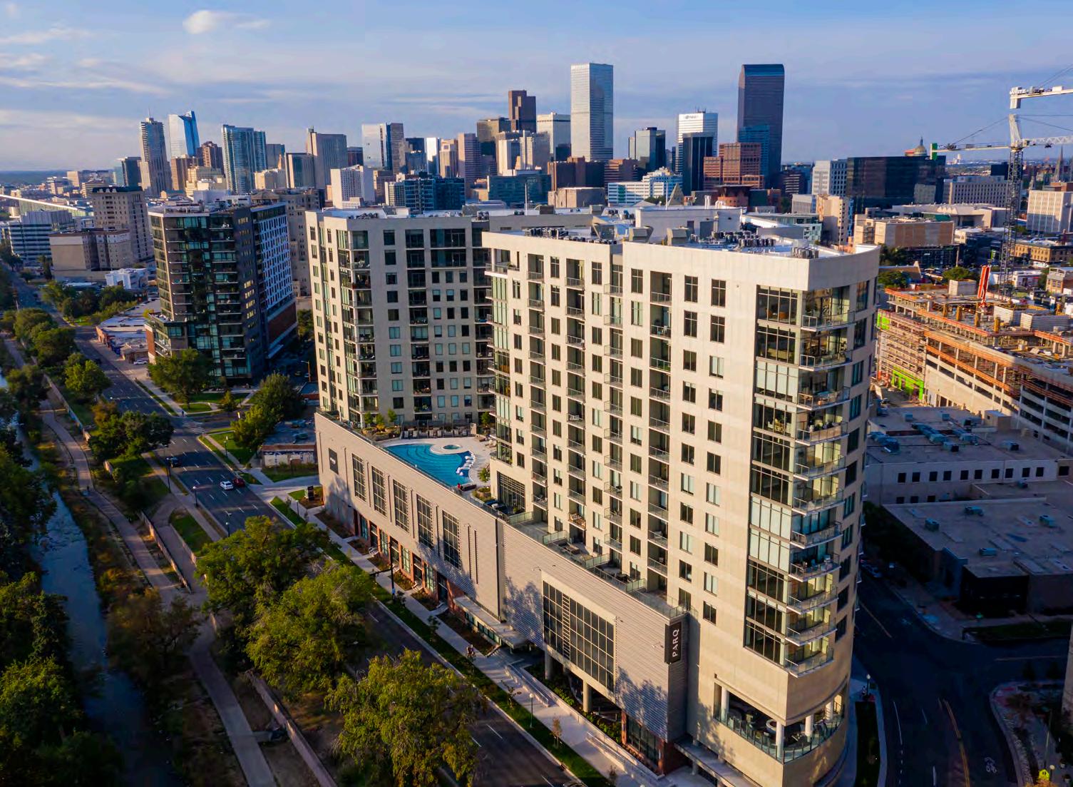 The development is an elevated take on upscale urban living, with an extensive amenity level that features a Club Room, Aqua Lounge, Fitness Center, Dog Park, Community Room, WiFi Lounge and Morning Room, all culminating in a 14,275 SF deck whose pool offers spectacular views of the Rockies beyond.