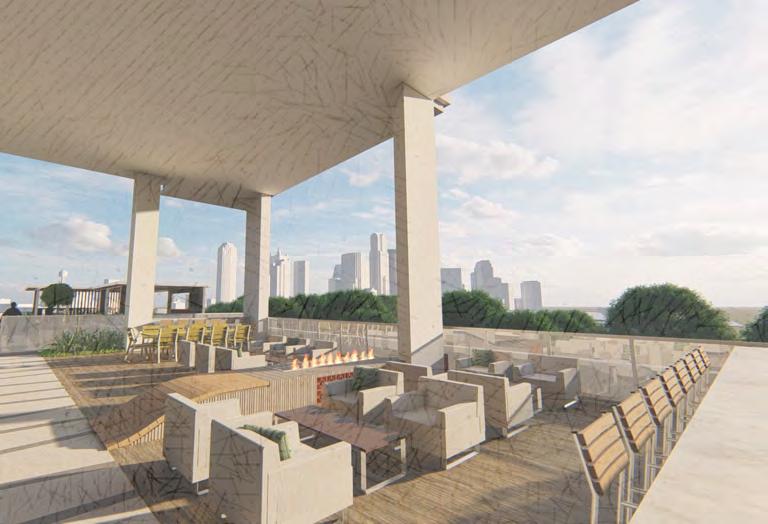 Designed by KW, the amenity deck includes a stunning glass-edge pool, inviting residents to relax and soak up the Texas sun while enjoying breathtaking views of the city skyline.