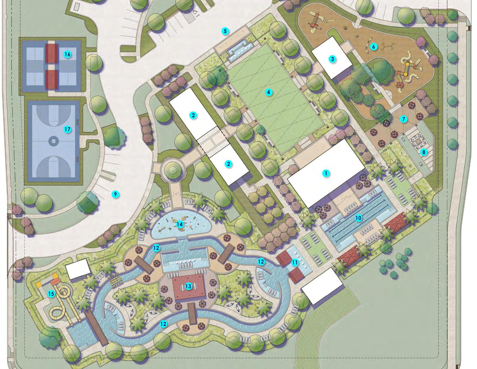 We work with various cost scales and budgets, offering amenities such as resortlevel swimming pools and lazy rivers, splash pads, sports courts, full-size changing rooms with showers, and concession stands. Our goal is to capture the essence of the community and create a space enjoyed and used by all.