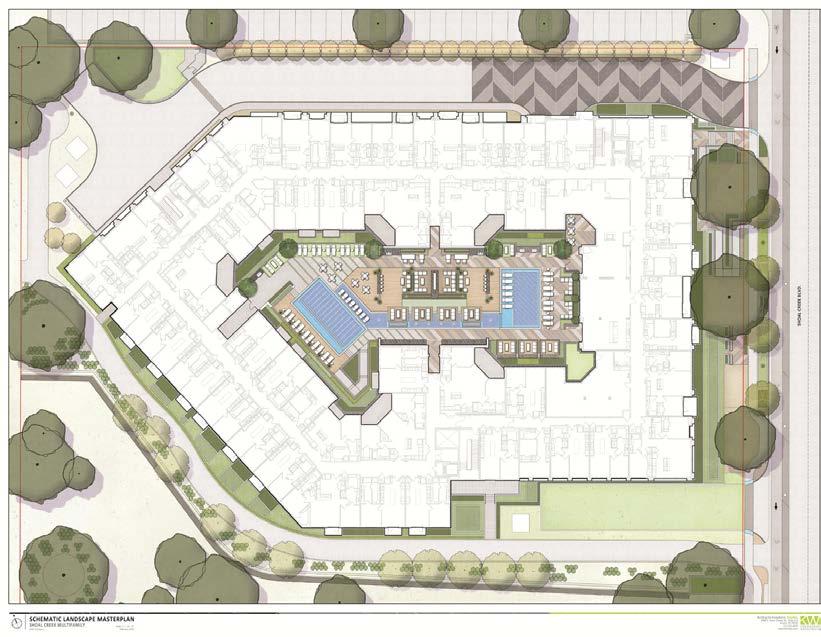 Breaking ground this fall, this project will be one of the first in the neighborhood, showcasing a modern and communityoriented design. Central to the project is a stunning pool courtyard with a unique pool running along the paseo, enhancing the serene ambiance. A small but well-designed dog park provides a dedicated space for pet owners, while a connection to the PARD Trail encourages outdoor activities. Our designs feature a welcoming streetscape and abundant lush plantings, creating a visually pleasing environment. Emphasizing simplicity and modernity, the overall design and materials ensure functionality and elegance. This project aims to set a new standard for multifamily living in the area, offering residents a blend of contemporary style and practical amenities in a vibrant and inviting community.