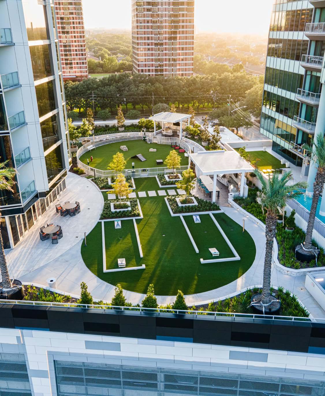 where residents can unwind amidst the swaying trees. The outdoor game terrace provides a dynamic space for leisure activities and friendly competition, fostering connections among neighbors. With a fully equipped outdoor kitchen elevating this space for hosting gatherings, outdoor lounge spaces offer opportunities for relaxation and socialization, every corner invites residents to unwind and connect with their surroundings. In essence, our landscape design of Aspire Post Oak reflects the pinnacle of luxury living, seamlessly blending timeless elegance with natural beauty to create an unparalleled residential experience in the heart of one of Houston’s most prestigious neighborhoods.