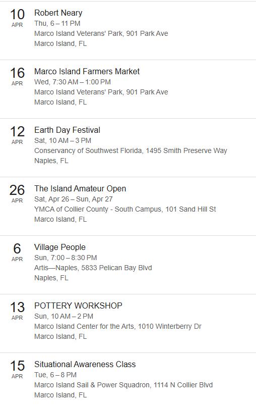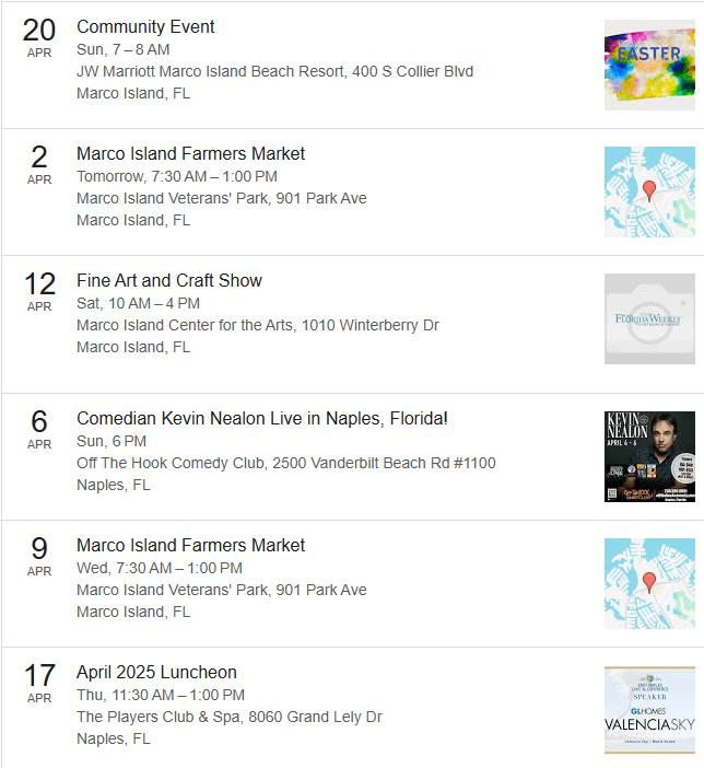 Marco Island Farmers Market: The final market of the season is on Wednesday, April 16, from 7:30 a.m. to 1 p.m. at Veterans Community Park. It's an excellent opportunity to support local vendors and enjoy fresh produce.