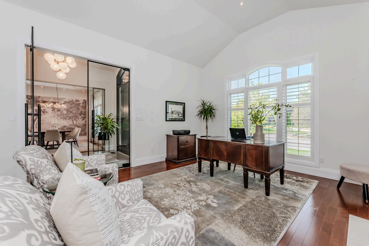 The heart of the home is its spectacular Chervindesigned kitchen, equipped with top-of-the-line Gaggenau appliances including a dual induction and gas cooktop, steam oven, wine and beverage fridges, and a full built-in refrigerator. A large quartz waterfall island, complete with a sink and dishwasher, is framed by custom walnut cabinetry, a range hood, and a statement walnut ceiling, making this kitchen a culinary masterpiece as well as an entertainer's dream An open-concept living area, illuminated by expansive windows, invites natural light. A cozy fireplace surrounded by custom built-ins adds warmth to the modern aesthetic, while the formal dining room with soaring ceilings sets the stage for sophisticated gatherings