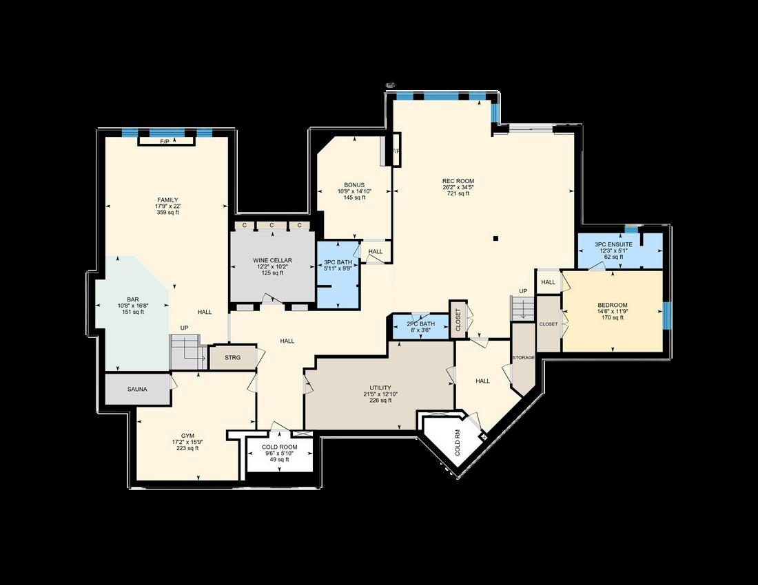 The finished walk out lower level offers a multitude of entertaining options The family room, with coffered ceilings and a gas fireplace, is adjacent to an expansive wet bar – completely outfitted with dishwasher, sink, microwave and 2 beverage fridges. For wellness enthusiasts, the personal fitness room and sauna provide a serene space for relaxation and rejuvenation. A wine cellar and tasting room cater to the discerning palate, offering a perfect spot to store and enjoy your favorite vintages. A bedroom and bonus room (which is being used as a bedroom) are also on this level, each with closets and 3-piece en-suite bathrooms. The spacious rec room, perfect for entertaining, features oversized windows, pot lights, a gas fireplace, a 2-piece bathroom, and sliders to the patio and pool.