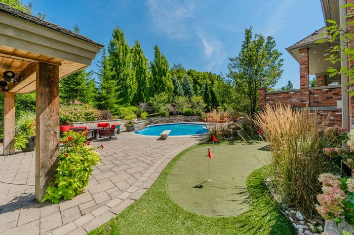 Step outside to your private oasis. The 20’ x 40’ saltwater inground pool, complete with a waterfall and diving board, is perfect for swimming and relaxation. The stone patio provides a comfortable space for outdoor dining and entertaining, while the stone wall and landscape lighting create a private and inviting atmosphere. Relax and unwind in the soothing waters of the hot tub, or practice your golf game on the private putting green. The pool house offers a convenient space for entertaining guests with its wet bar and plenty of seating. Multizone Sonos surround sound throughout the home and yard enhances the entertainment experience, providing immersive audio for your outdoor gatherings and indoor relaxation.