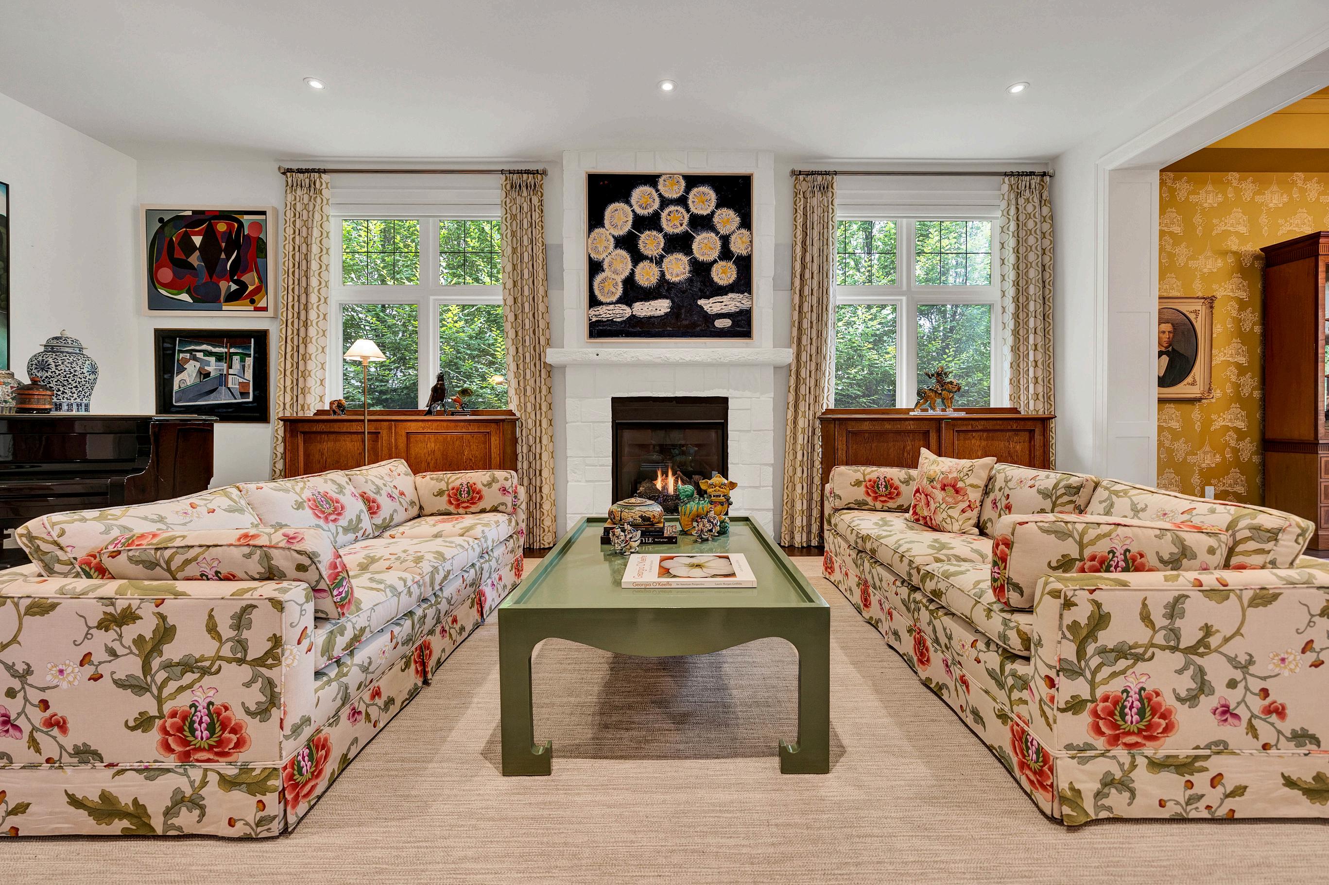 The living areas feature soaring 10-foot ceilings, rich wood flooring, and gallery-like wall space ideal for displaying art. Expansive windows along the rear of the home fill the space with natural light and frame views of the private gardens, enhancing the open and uplifting atmosphere. A fireplace adds warmth and a focal point, making this a welcoming space for gatherings.