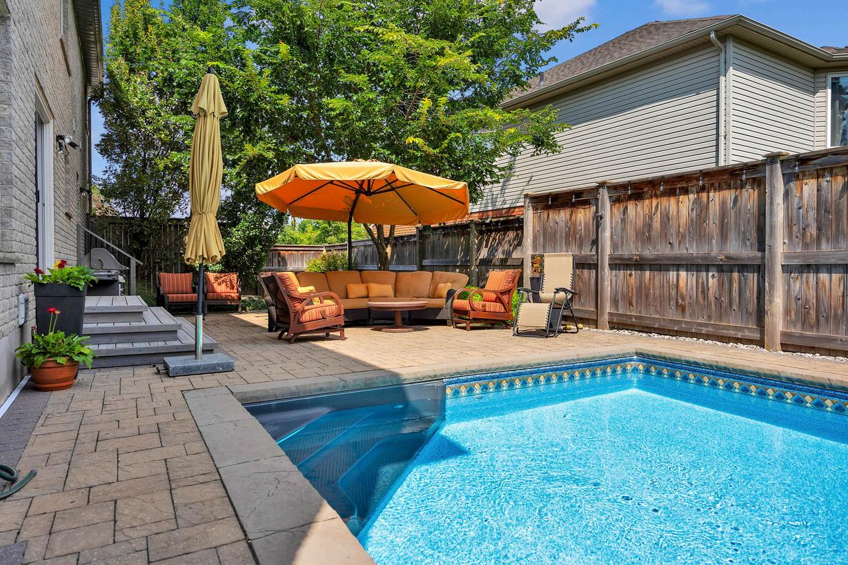 The backyard is an oasis, featuring a professionally maintained 14x30 heated saltwater pool with a filter, heater, liner, winter cover, pump, and solar blanket. The irrigation system and landscape lighting enhance the outdoor space, while mature trees provide beauty and privacy. A partial wood fence defines the area, making it a perfect place for relaxation or summer gatherings. Multiple seating areas create inviting spaces for outdoor dining, lounging, and entertaining. Lush landscaping and manicured gardens complete this serene retreat, offering a perfect blend of privacy, function, and outdoor enjoyment yearround.