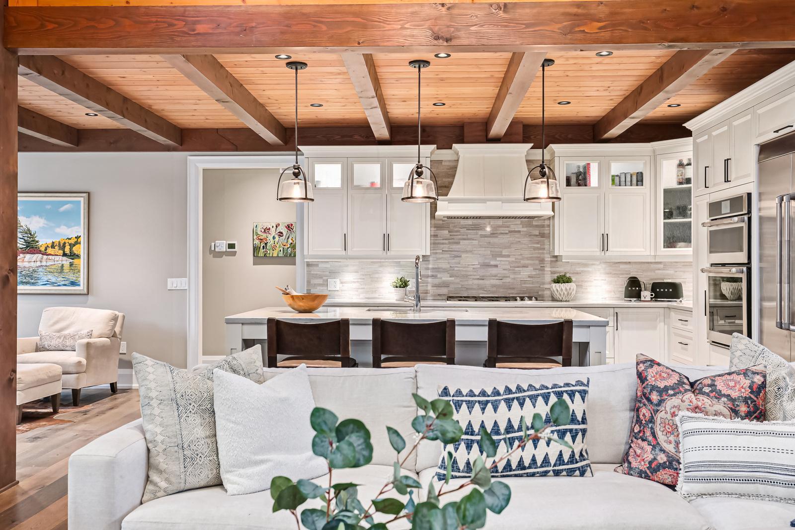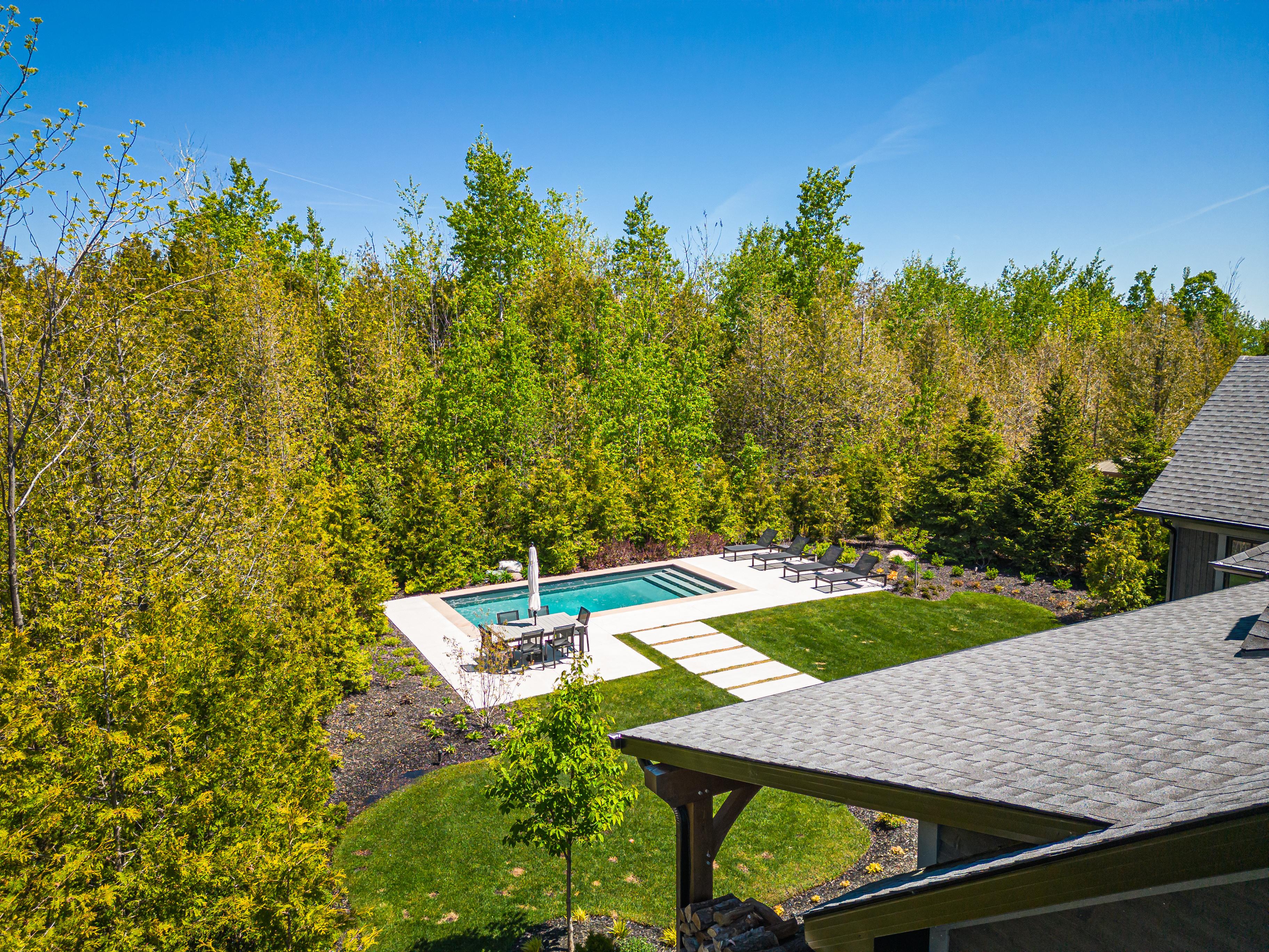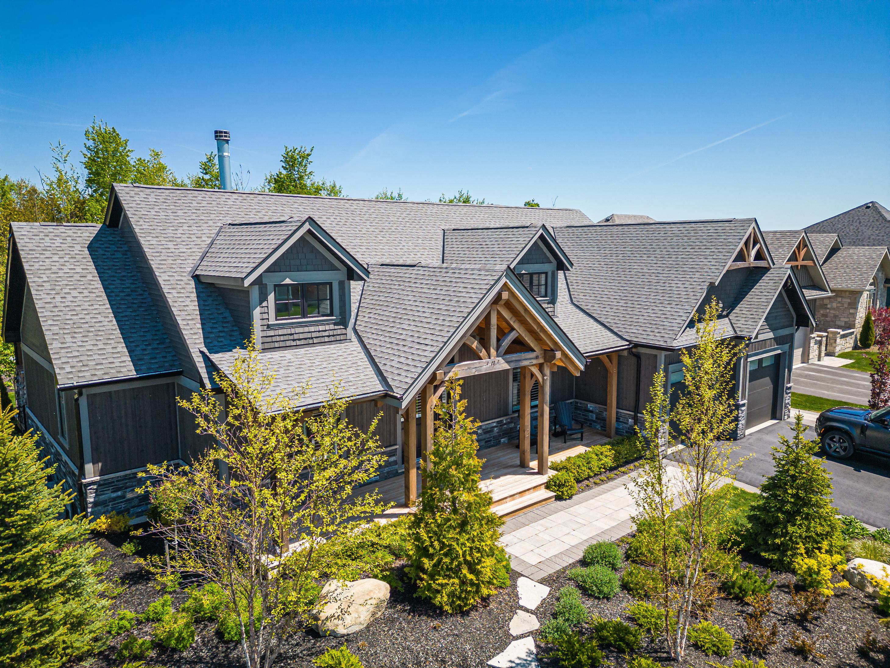 Exquisite Custom-Built Home with Private Pool and Finished Lower-Level! Tucked away in a quiet community, just a 15-minute drive from Blue Mountain, offering delightful vistas of the Georgian Peaks, this 5BR/5BA residence captures the heart with gorgeous heavy timber construction, lavish landscaping, custom paver sidewalk, and a covered front porch. Luxuriously styled to accommodate both form and function, the interior features an organically flowing split floorplan, vaulted wood-beam ceilings, stunning wood floors, and a glorious great room with 15’ ceilings.