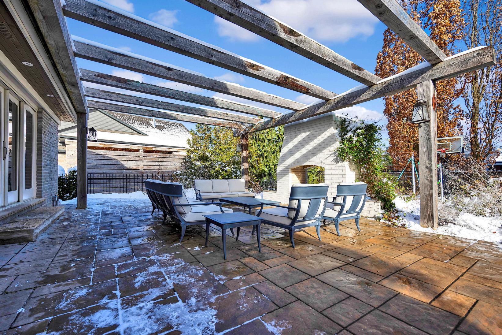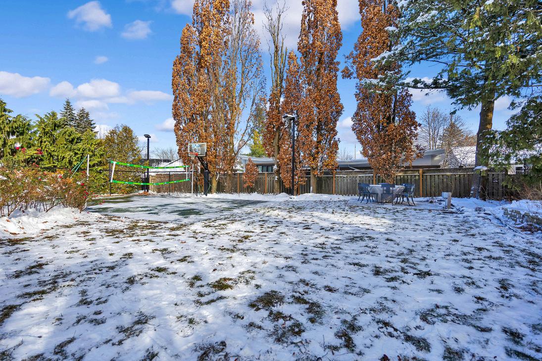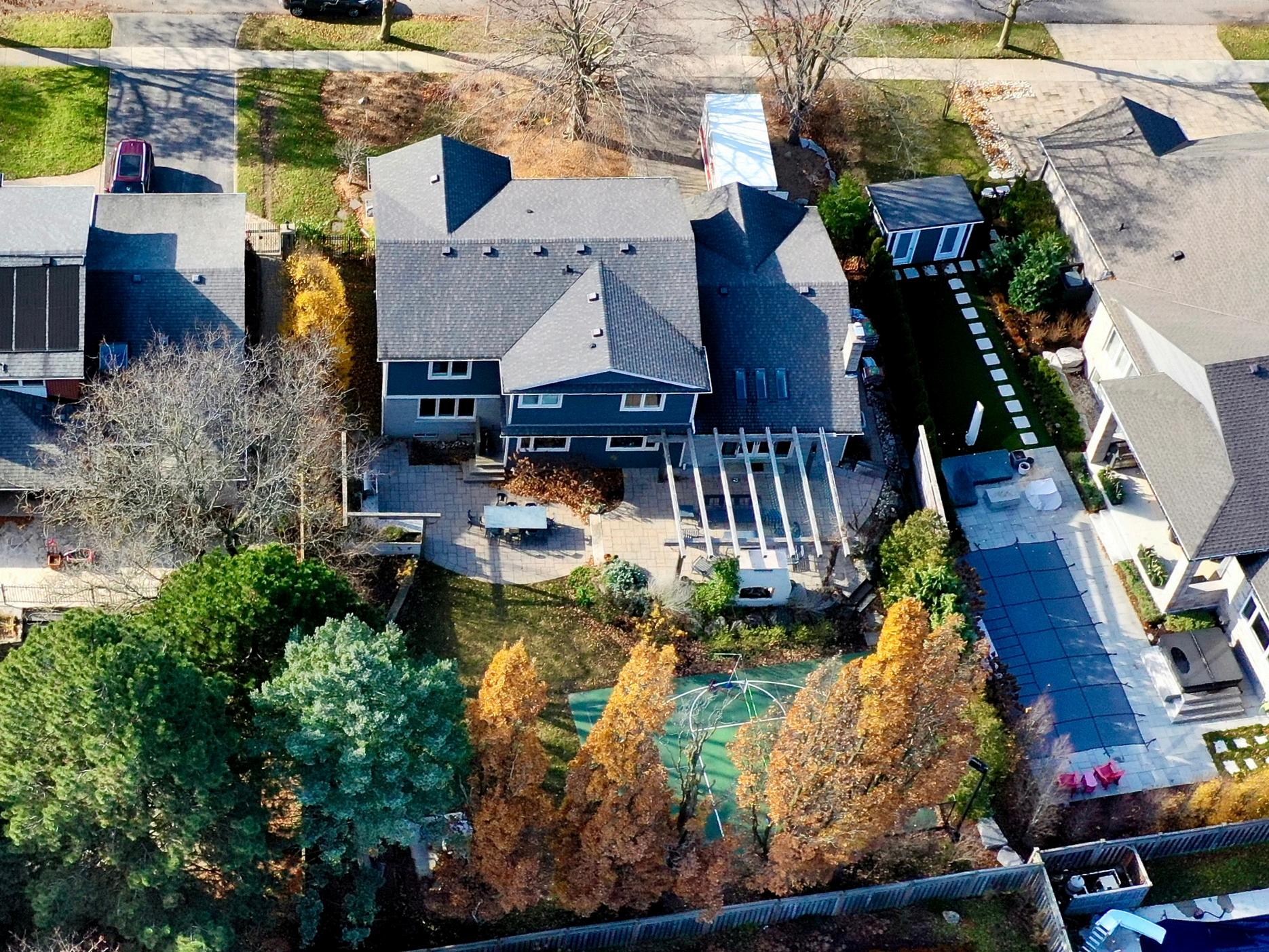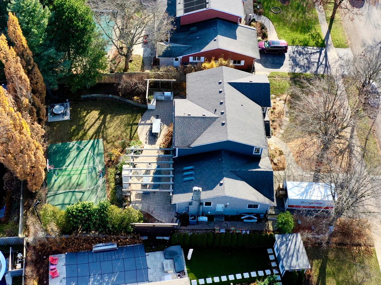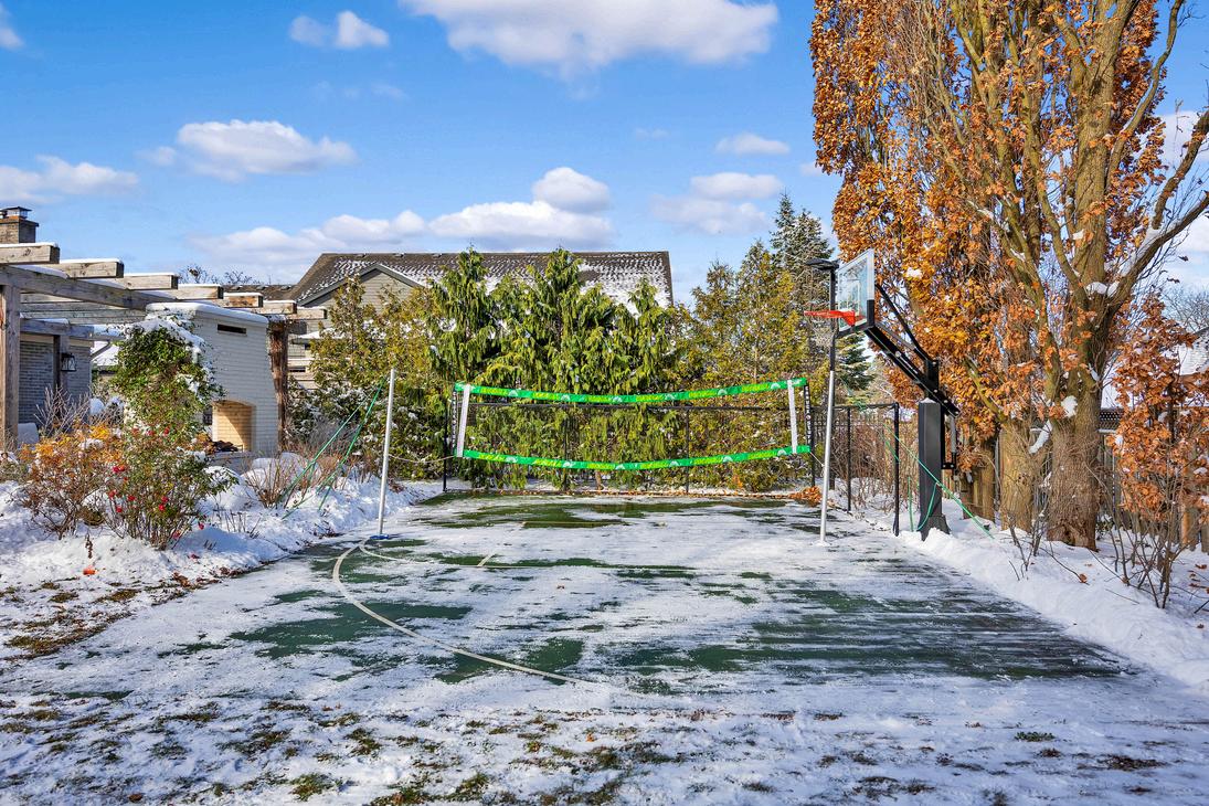 The professionally landscaped backyard, completed by Landscape Plus in 2017-2018, is a private oasis blending beauty and functionality. A gas-powered custom-built outdoor fireplace offers warmth and visibility to the play area. The half-court sports area, with adjustable basketball and pickleball nets, doubles as a volleyball court or a winter ice rink, all illuminated by sports lights. The lush gardens, designed by a landscape architect, feature a stunning array of roses, peonies, lilacs, lavender, and Russian sage, attracting pollinators while providing vibrant blooms from spring to fall. Mature trees, including copper beech, magnolias, hornbeams, and Japanese maples, enhance privacy and natural beauty. Additional features include a stone patio, built-in BBQ with matching granite counters, raised herb planters, and a cement pad wired for electricity, ideal for a future studio, hot tub, or playhouse. The thoughtful design and mature landscaping create a serene retreat perfect for relaxation and entertaining.