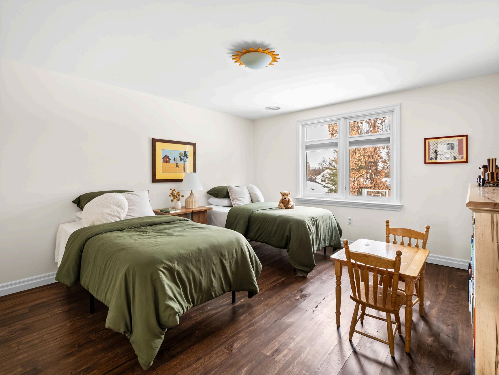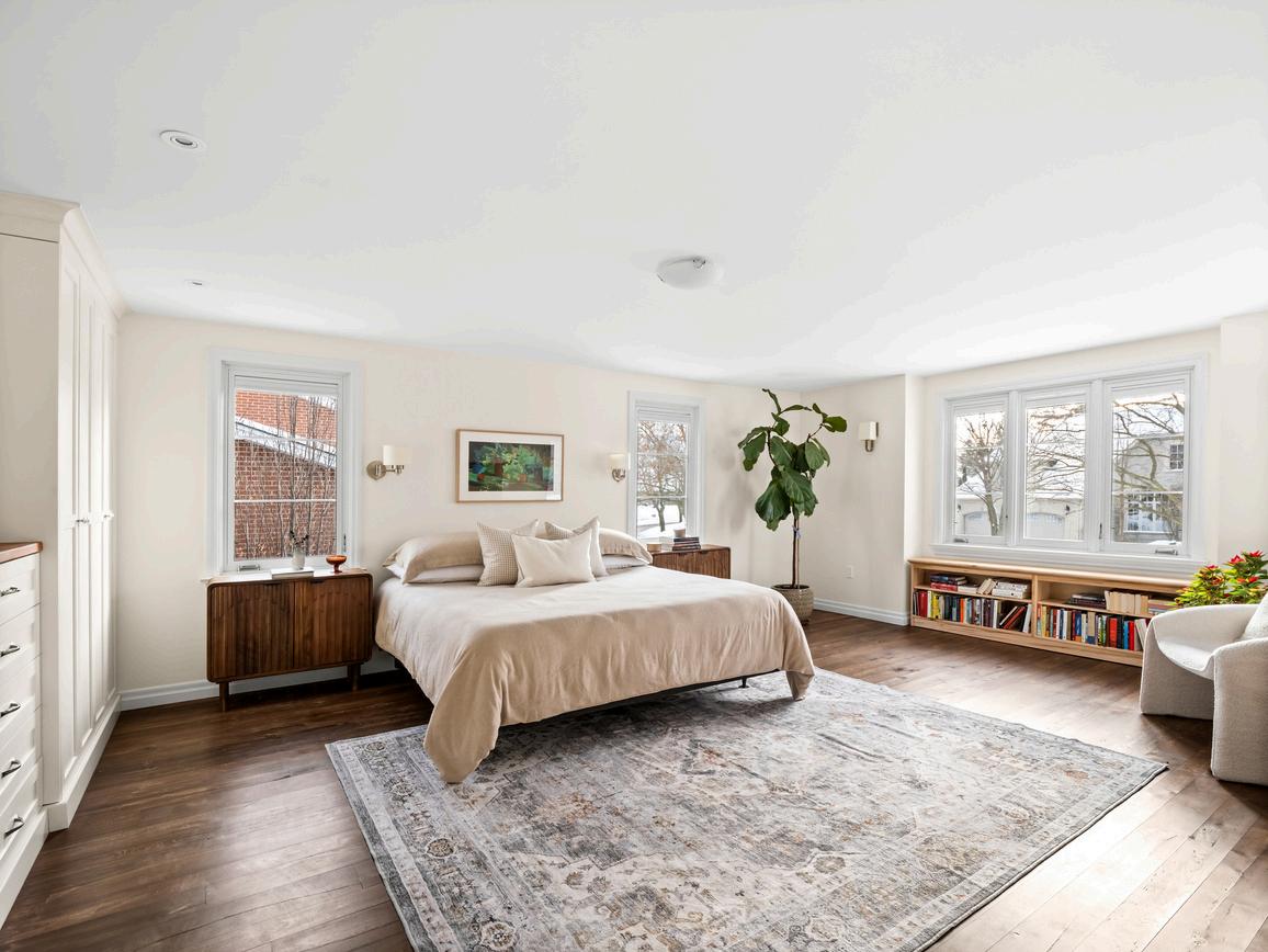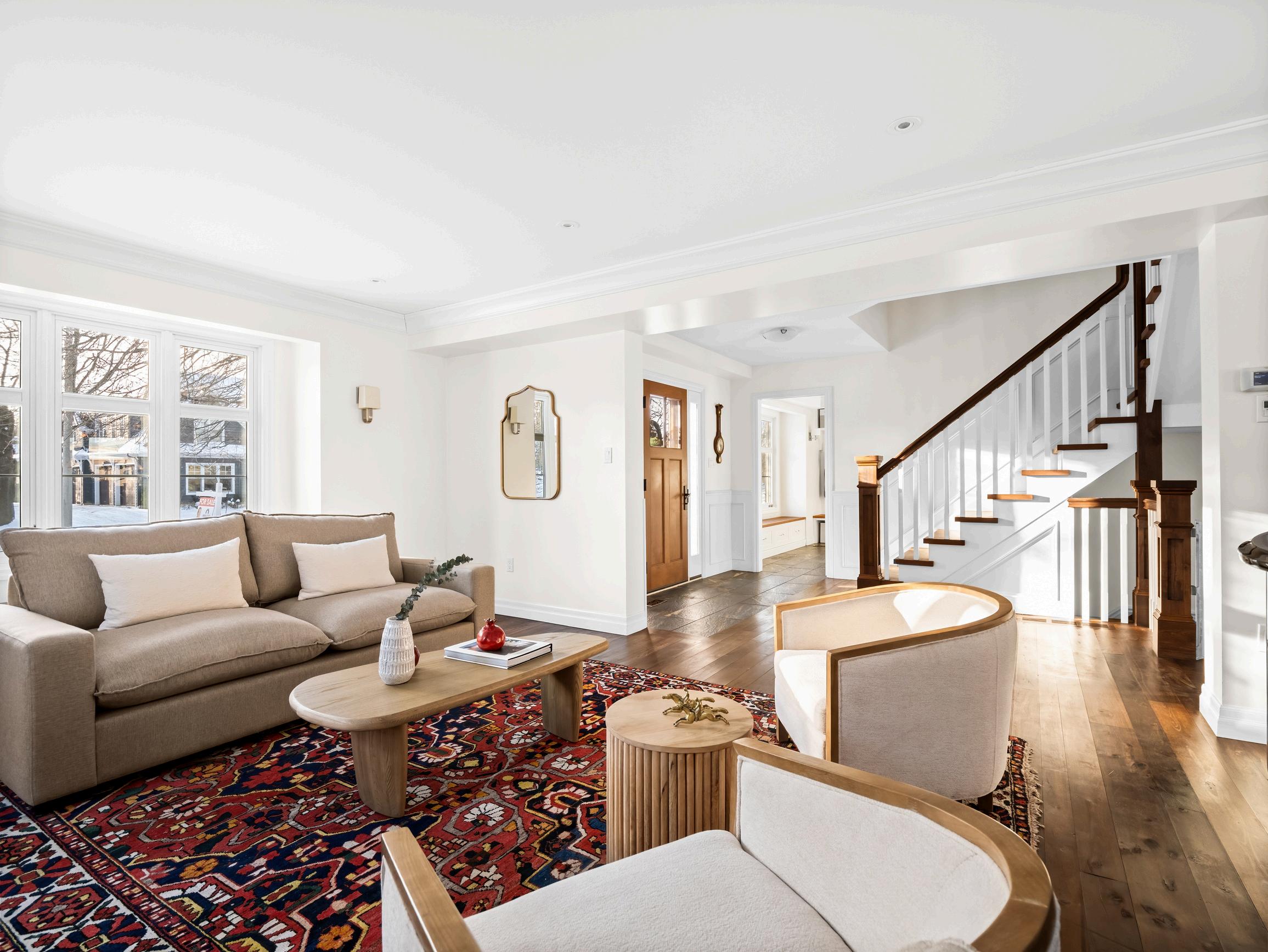 The living spaces in this home are designed for both relaxation and connection. The family room is bathed in natural light from three Velux skylights, featuring a gas fireplace with a Brazilian soapstone surround and a reclaimed Douglas fir mantel. The living room offers a second gas fireplace for warmth and elegance, with hidden storage beneath the bench for added functionality. Throughout the home, reclaimed oiled elm wood floors, expertly installed by Jason Vivash, provide character and a seamless sense of continuity.