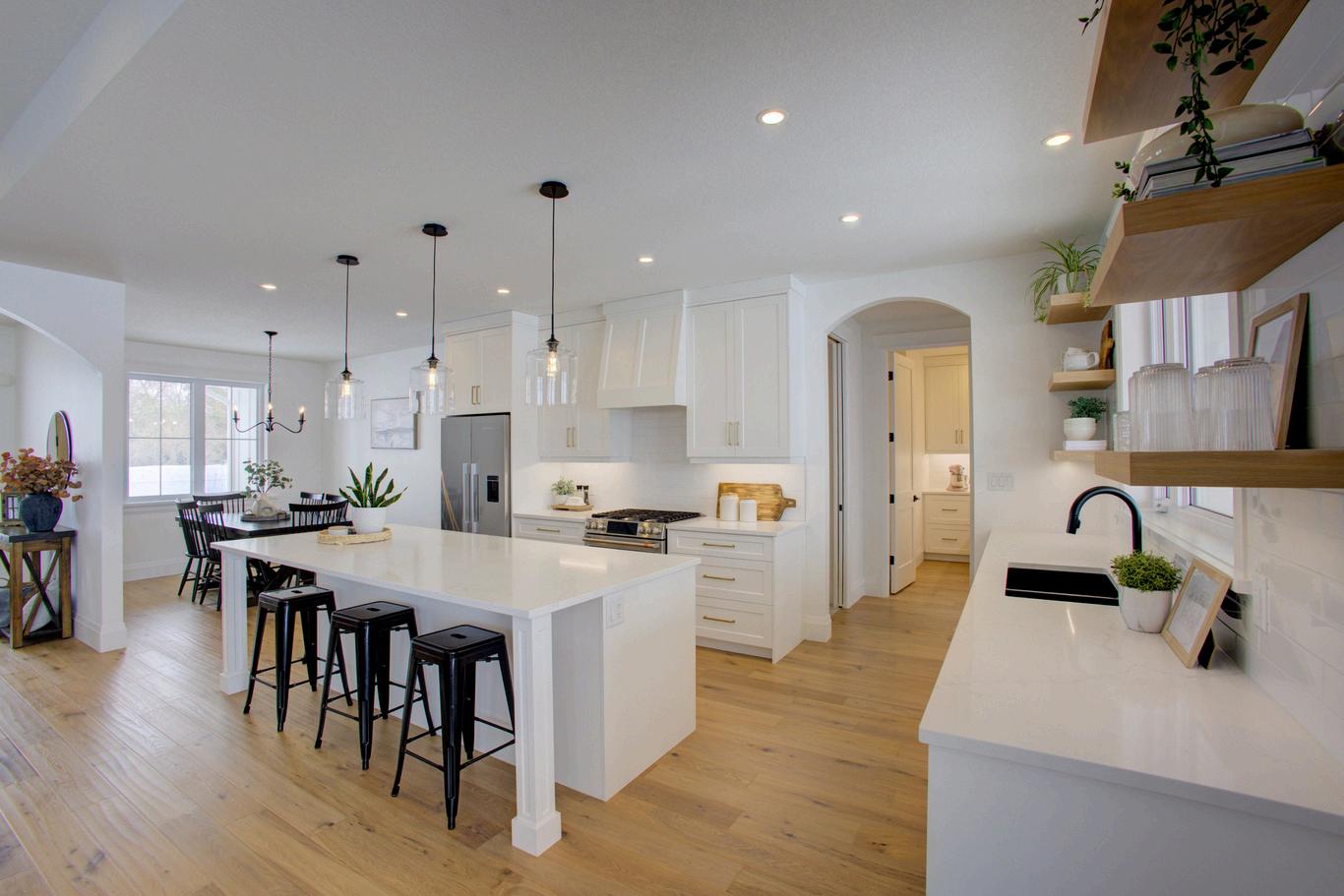 The custom Mennonite-made kitchen is a perfect blend of craftsmanship and practicality, featuring solid wood dovetail drawers, quartz countertops, and a walk-in pantry for seamless organization. A spacious island invites conversation and casual dining, while vaulted ceilings and expansive windows fill the space with natural light. Overlooking the open living area, a striking shiplap fireplace adds warmth and charm, creating a welcoming space for both everyday living and entertaining.