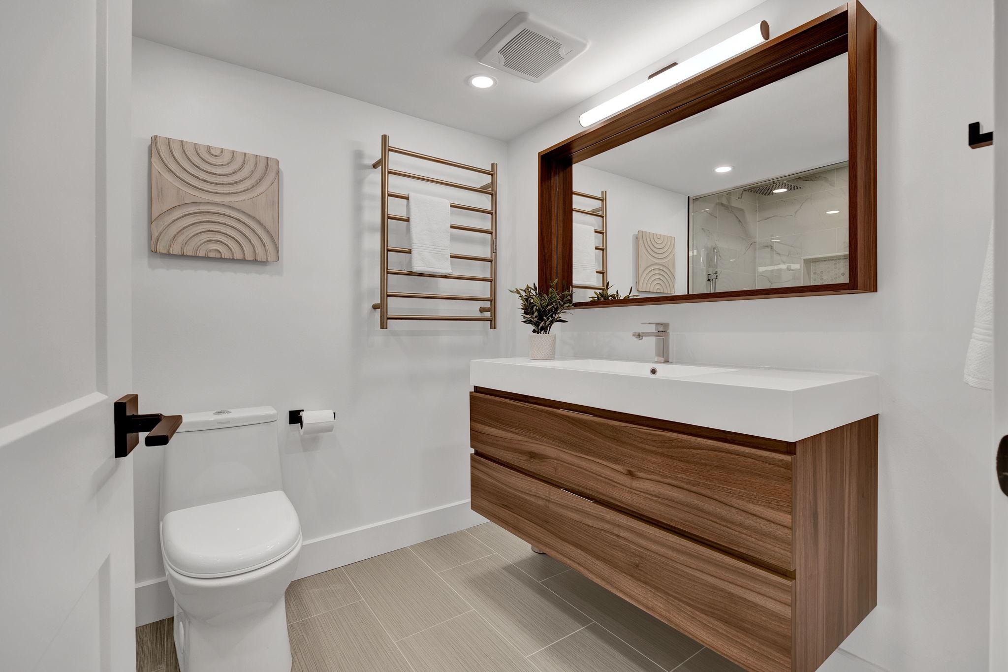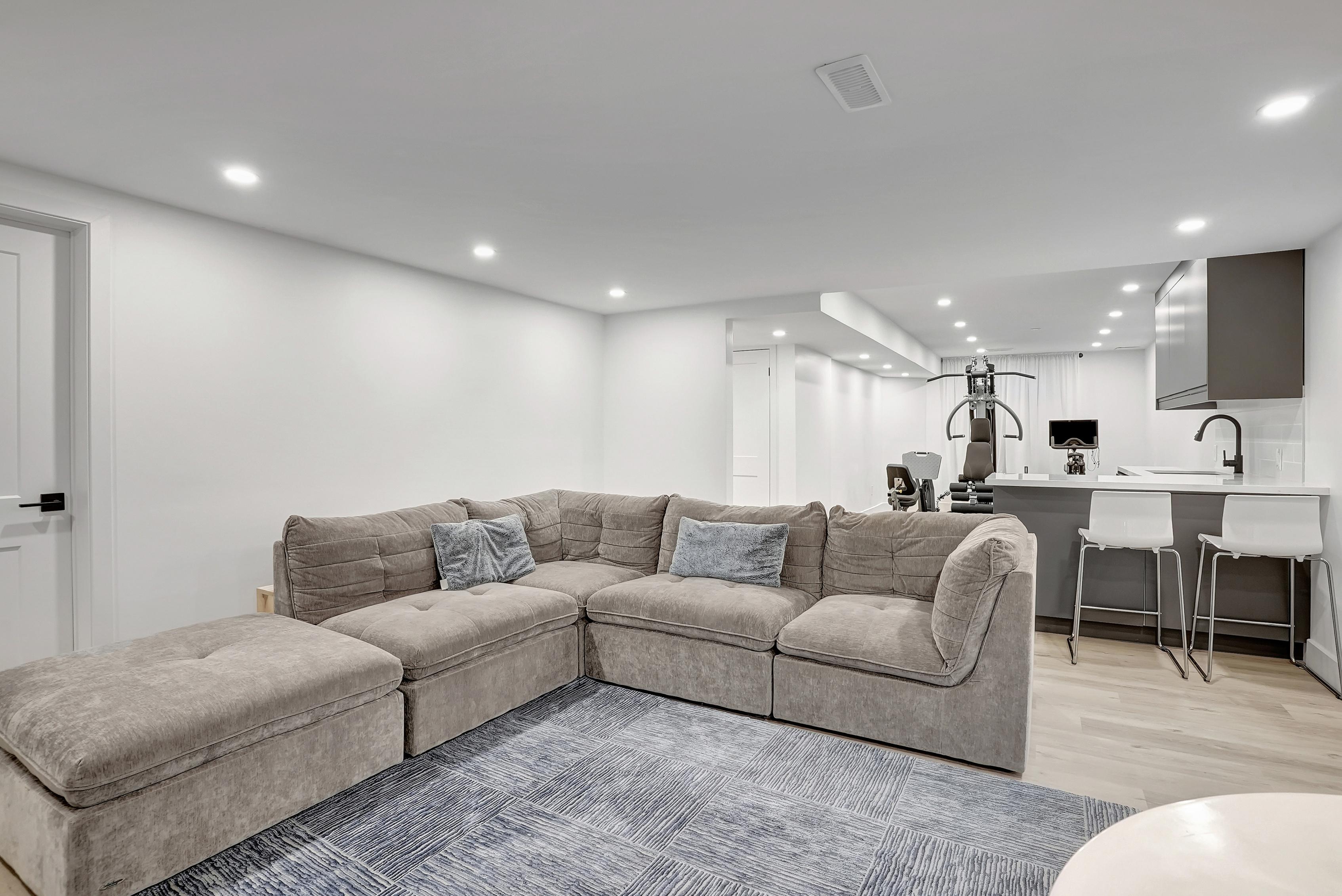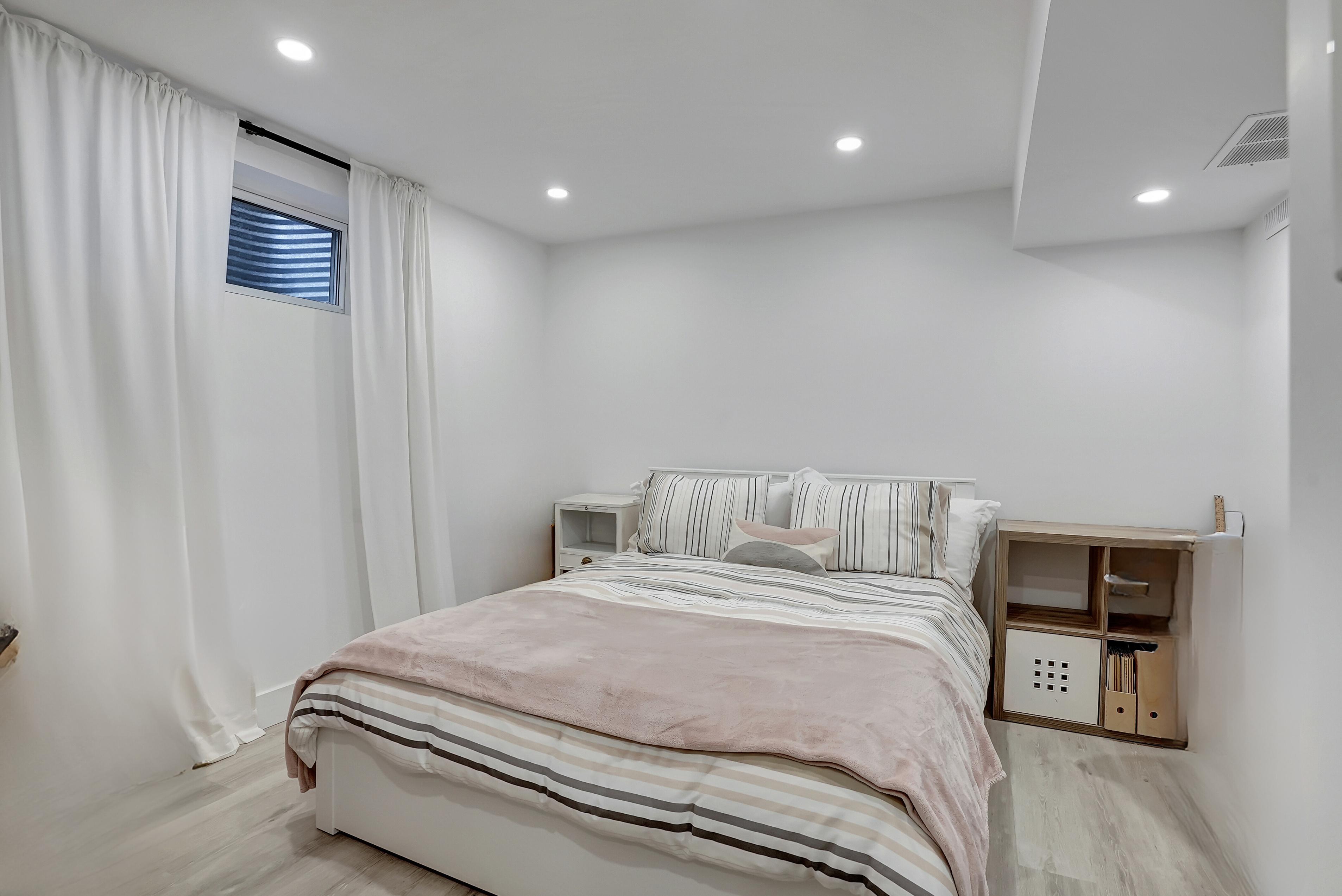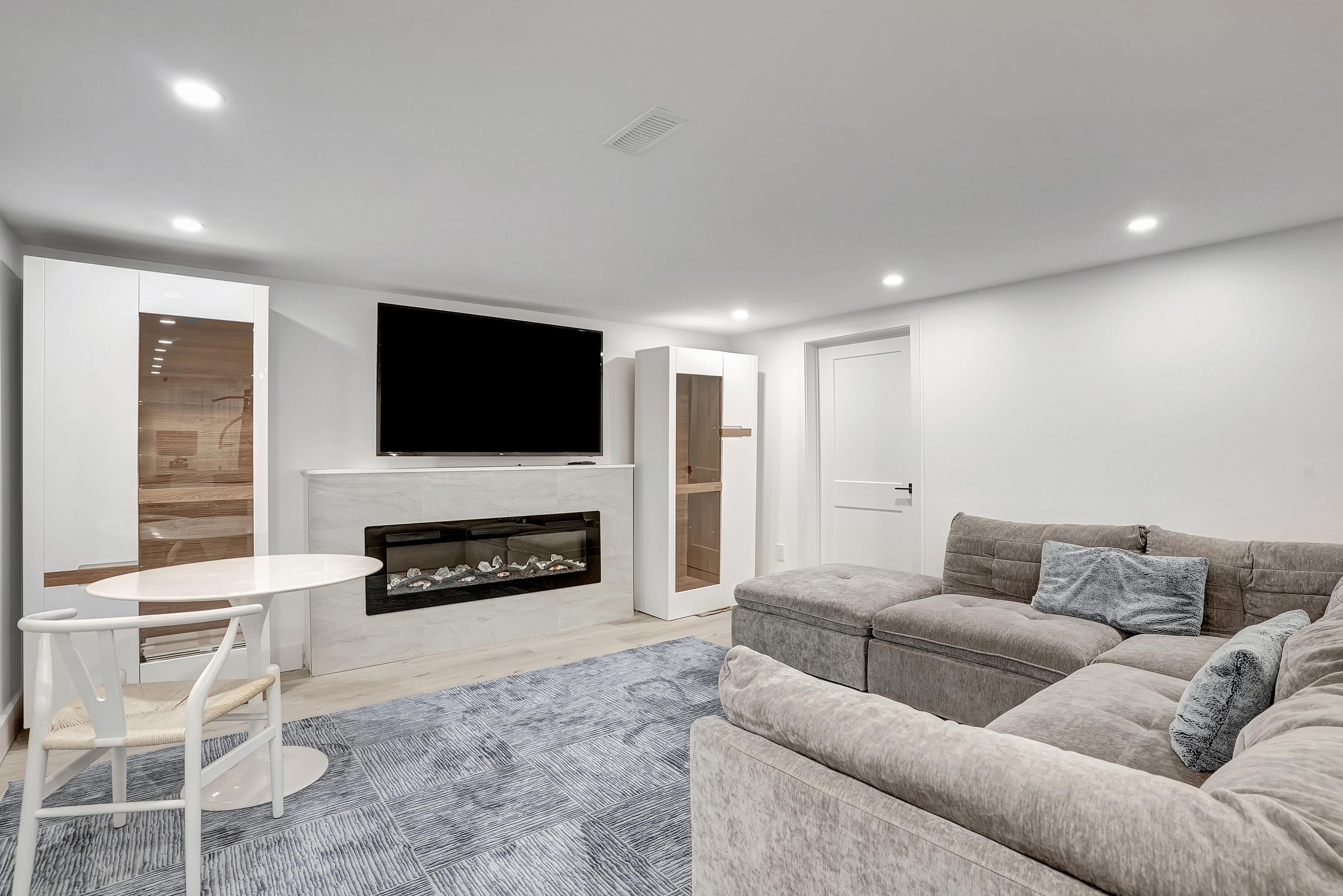 Boasting a thoughtful layout, this basement retreat features two cozy bedrooms, providing ample space for guests or family members. A stylishly appointed bathroom offers convenience and comfort, while a spacious living room invites relaxation and entertainment around the electric fireplace The addition of a kitchenette, complete with quartz countertops, ensures effortless hosting and culinary endeavors