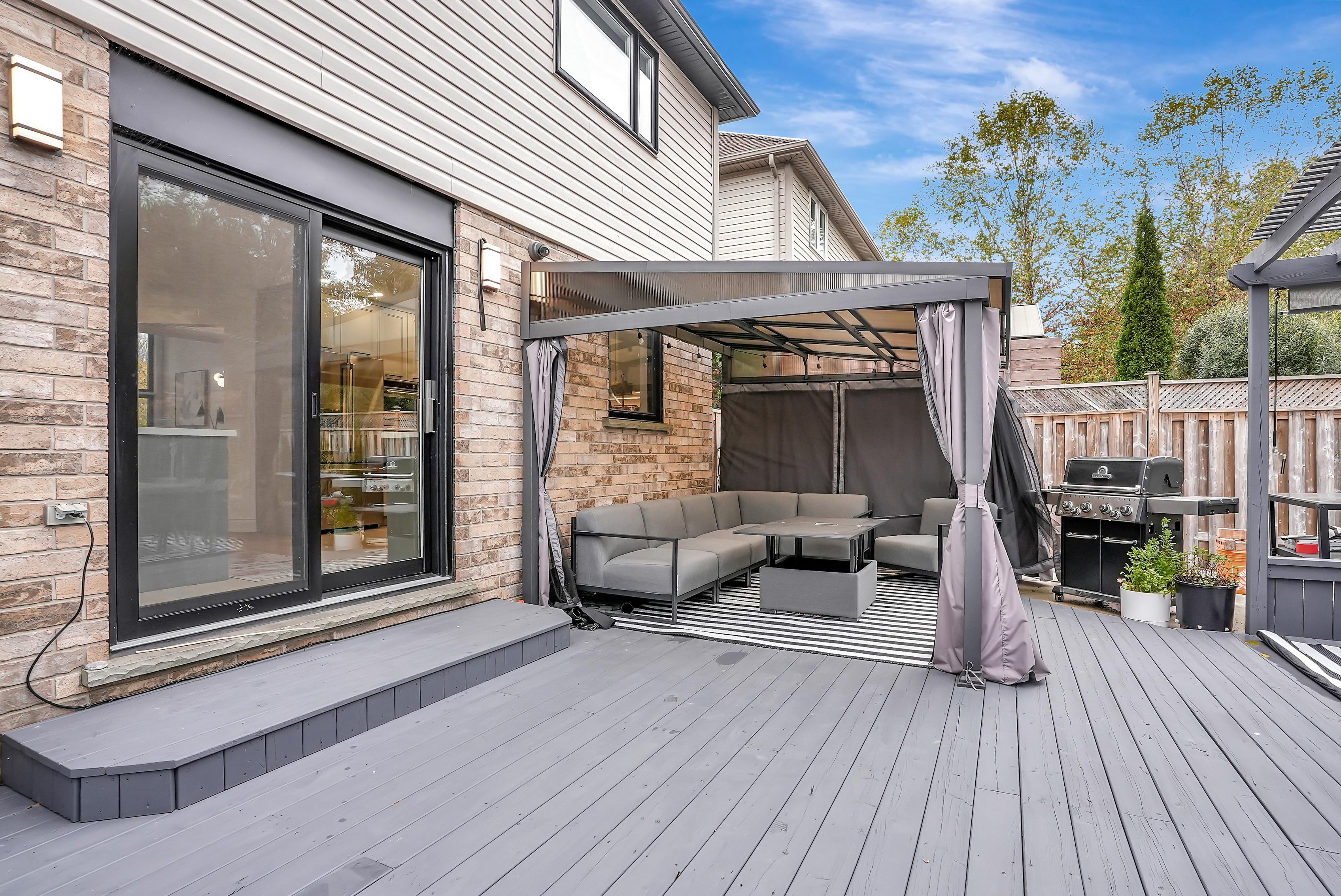In the backyard, a sliding room gazebo provides a perfect spot for gatherings, complemented by a refinished deck, pergola, and storage shed.