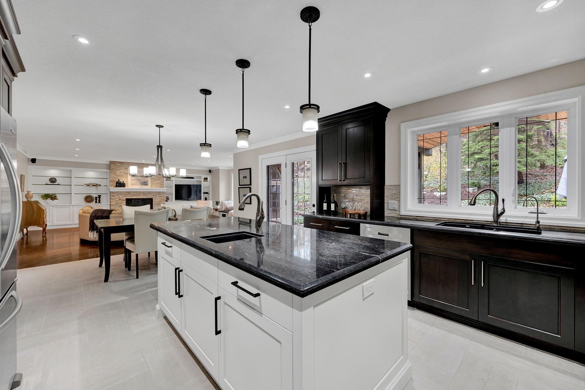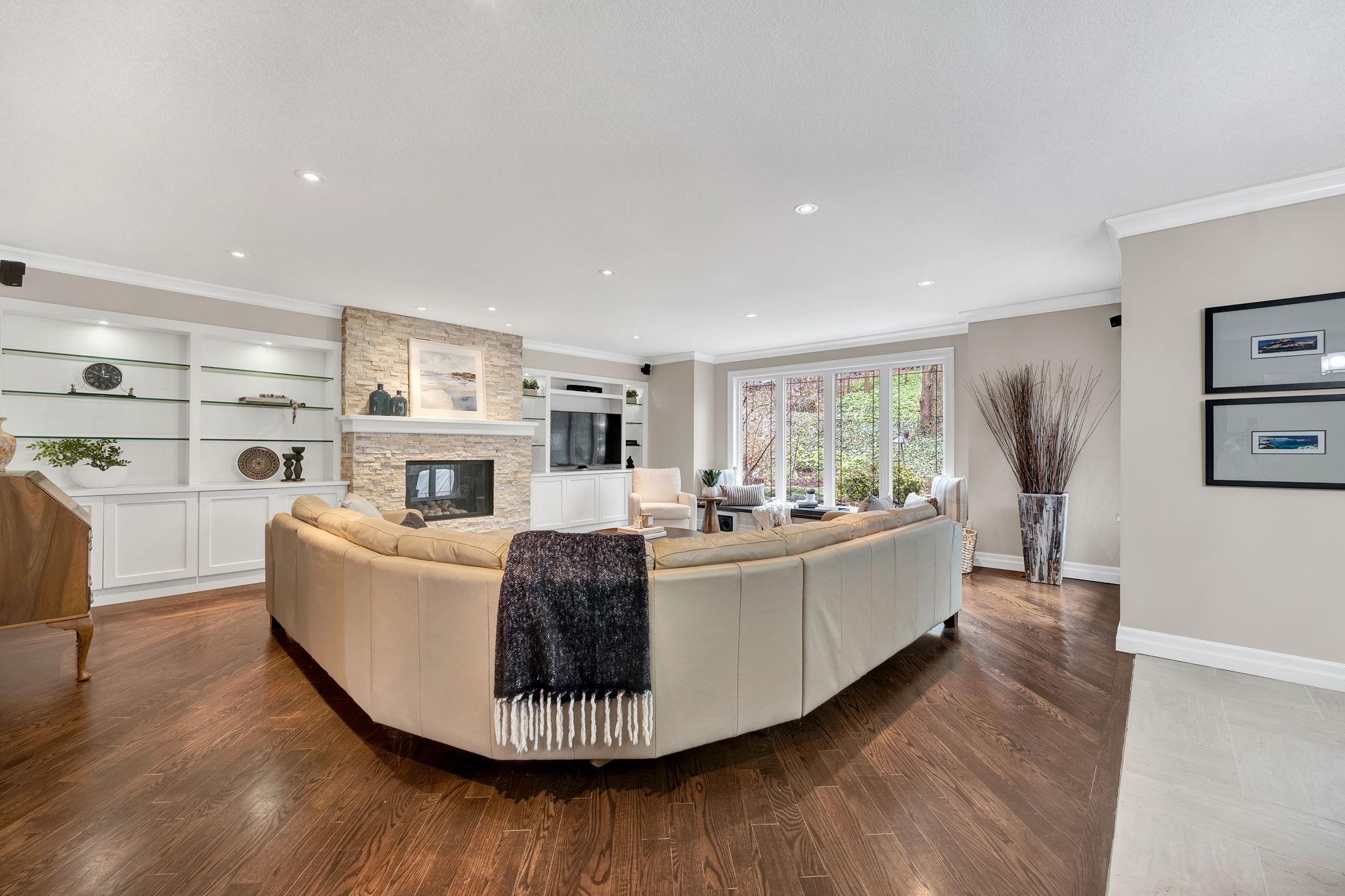 An open layout allows conversations to as the kitchen gracefully merges with th area Custom-built bookshelves with sle shelves stand as a testament to refined showcasing cherished mementos and li treasures. The focal point of the living ro majestic gas fireplace, exudes warmth a cozy gatherings. Bathed in natural light windows, the space is further enhanced charming window with inviting bench se creating a cozy nook for relaxation and contemplation.