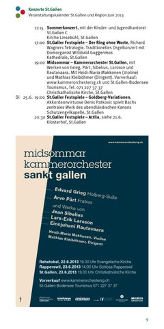 11:15 Sommerkonzert, mit der Kinder- und Jugendkantorei St.Gallen C Kirche Linsebühl, St.Gallen 17:00 St.Galler Festspiele – Der Ring ohne Worte, Richard Wagners Tetralogie. Traditionelles Orgelkonzert mit Domorganist Willibald Guggenmos Kathedrale, St.Gallen 19:00 Midsommar – Kammerorchester St.Gallen, mit Werken von Grieg, Pärt, Sibelius, Larsson und Rautavaara. Mit Heidi-Maria Makkonen (Violine) und Mathias Kleiböhmer (Dirigent). Vorverkauf: www.kammerorchestersg.ch und St.Gallen-Bodensee Tourismus, Tel. 071 227 37 37 Christkatholische Kirche, St.Gallen Di 25.6. 19:00 St.Galler Festspiele – Goldberg-Variationen, Akkordeonvirtuose Denis Patkovic spielt Bachs zentrales Werk des abendländischen Kanons Schutzengelkapelle, St.Gallen 20:30 St.Galler Festspiele – Attila, siehe 21.6. Klosterhof, St.Gallen