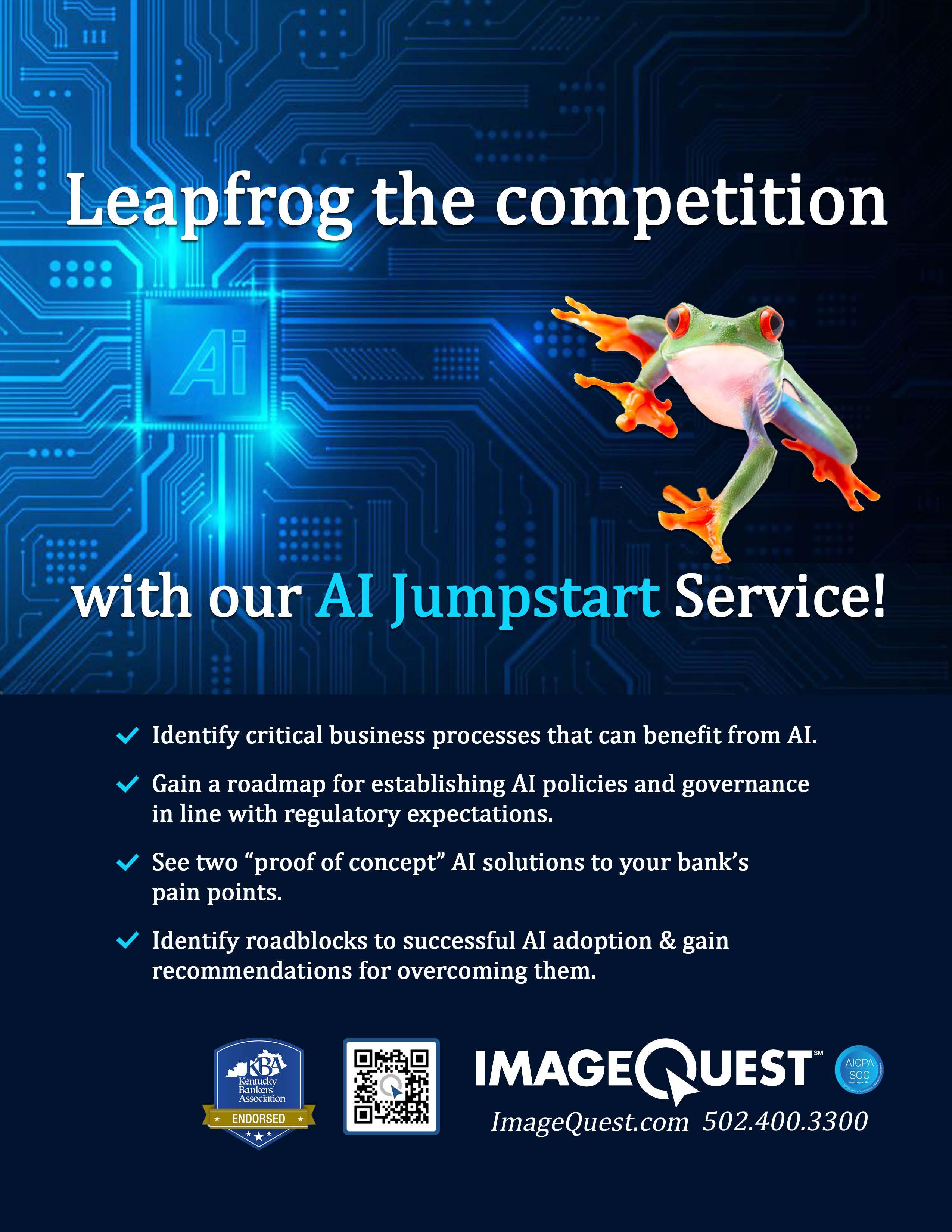 KENTUCKY BANKER is the official bi-monthly magazine of the Kentucky Bankers Association (KBA). No part of this magazine may be reproduced without express written permission from the KBA. The KBA is not responsible for opinions expressed by outside contributors published in KENTUCKY BANKER. The KBA reserves the right to publish submissions at the discretion of the KENTUCKY BANKER editorial team. For more information, or to submit an article, pictures or pass on a story lead, contact Matt Simpson, Managing Editor, at msimpson@kybanks.com
