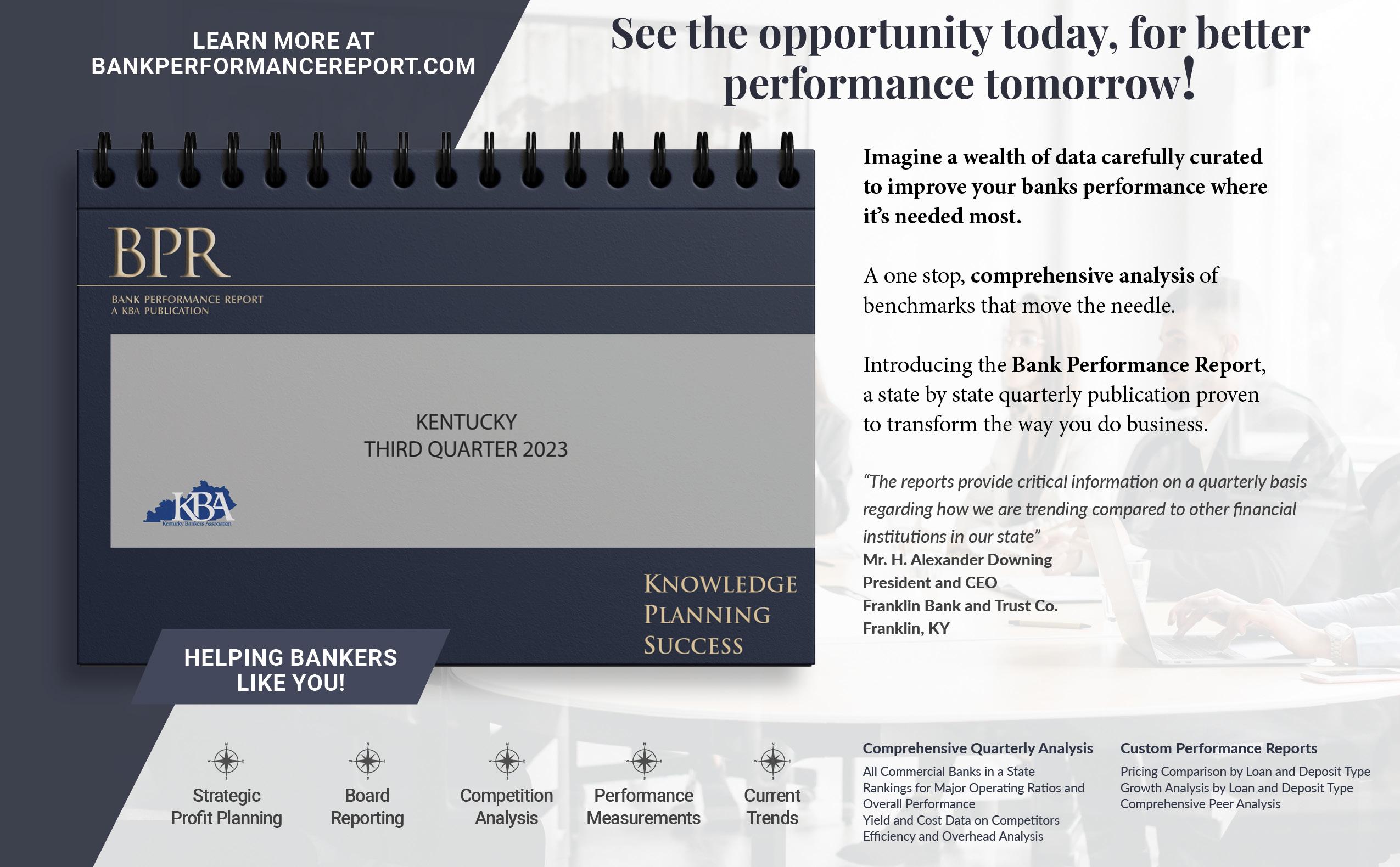 WHAT WE DO: The purpose of the Kentucky Bankers Association is to provide effective advocacy for the financial services industry both in Kentucky and on a national level; to serve as a reliable and responsive source of information and education about areas of interest to the industry; and to provide a catalyst and forum for collective industry action. The KBA does this in 4 ways: