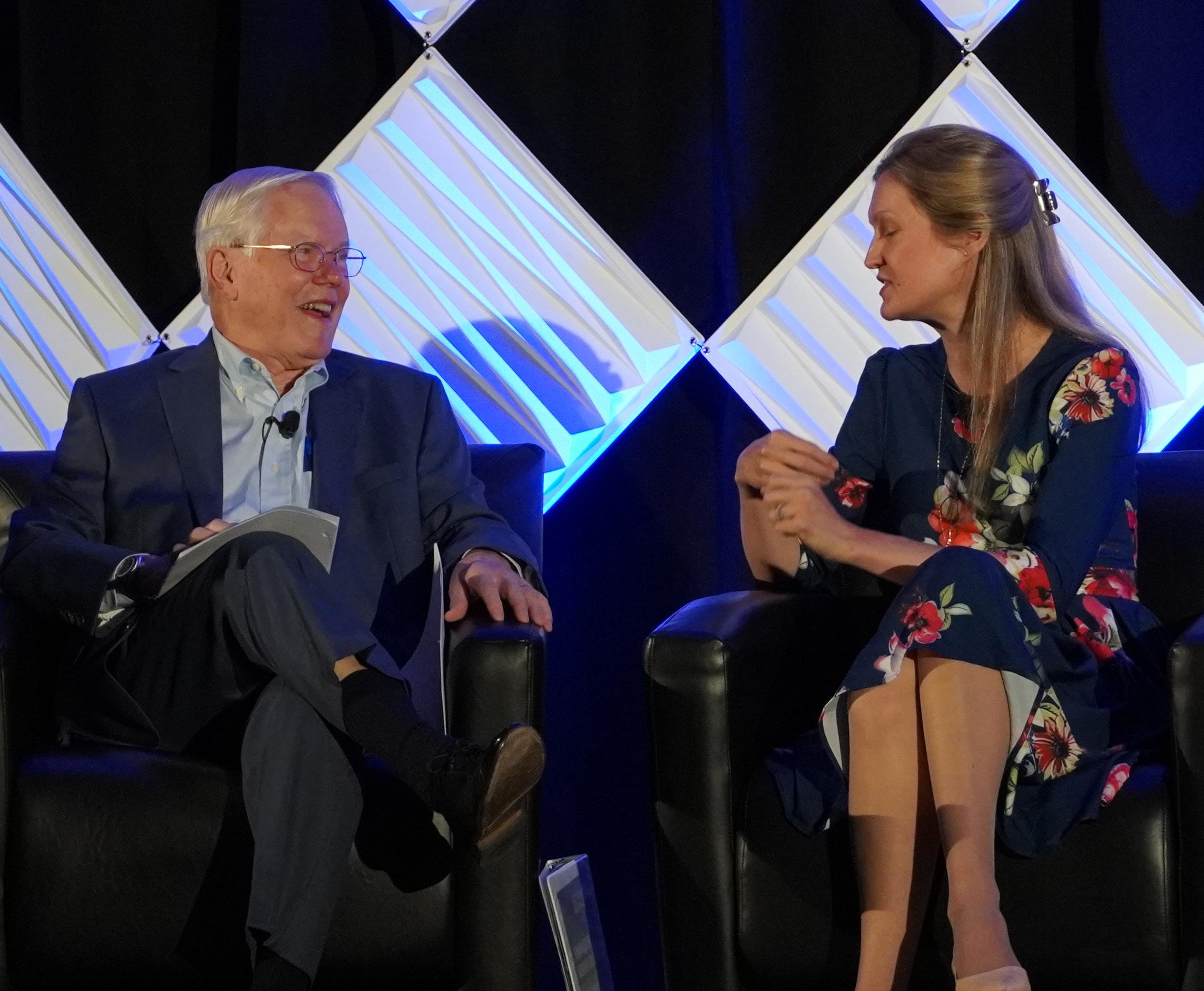 One of the great things about how our sessions are organized is that we get to talk to the presenters after they give their remarks. We get to get to ask them some questions after they speak. Joining me on the stage to interview the speakers this year were John McGarvey (our perennial emcee), and our 2021-2022 Chairman, Ja Hillebrand.