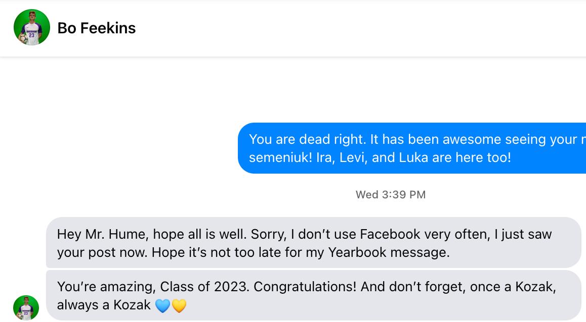 By way of providing a little something to make up for that, the yearbook team put out a call to Kozaks who wanted to 'sign' your yearbook for you. Since we used Facebook, the congratulations below are screen-grabs of the messages we got back.