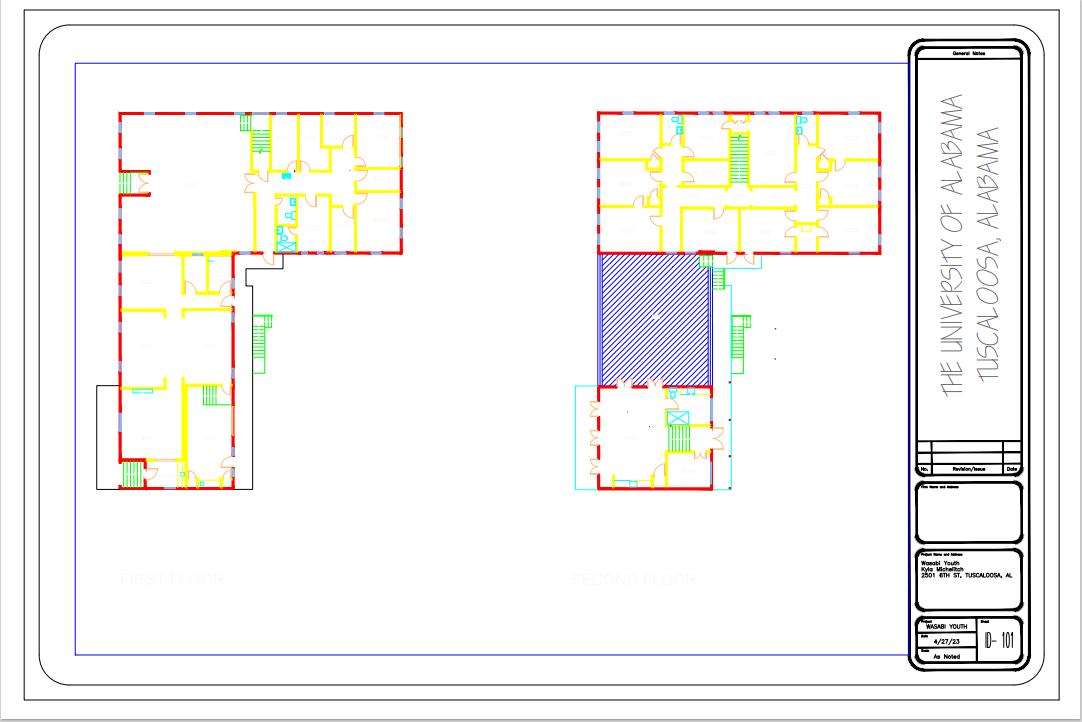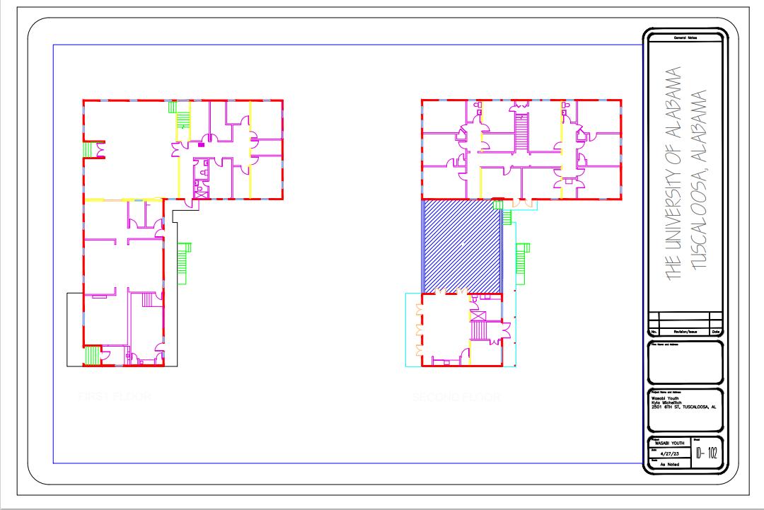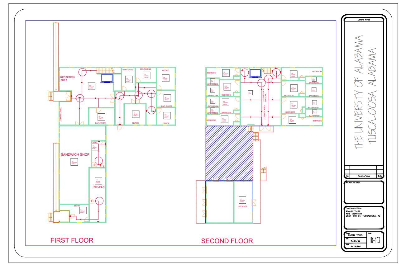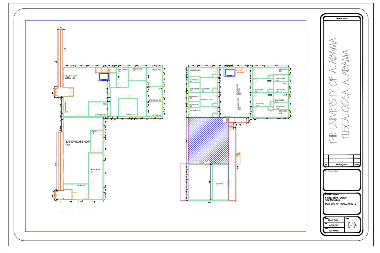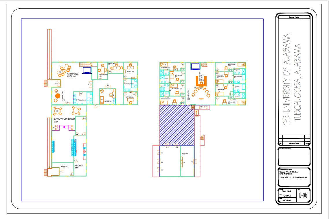 Wabi Sabi foundation supports an unconventional youth shelter as a home for runaway youth located at 201 6th in Tuscaloosa, AL. The foundations mission is to inspire, uplift and bring about positive change. Consistent with this mission is a commitment to sustainability and environmental responsibility. The foundation's goal is to provide a secure, stable facility designed to inspire and change lives. The facility provides housing and a healing and rehabilitating environment for youth aged 13-17 who are in crisis. The length of stay is determined on a case-by-case basis. The term unconventional refers to the fact that the foundation desires the completed design to resemble a home rather than an institutional facility. The design should follow the philosophy of wabi-sabi. A apanese philosophy that embraces the beauty of the imperfect and the necessity of preserving materials and objects that are worn but still useful rather than discarding them and celebrating their imperfections. Along with the concept of wabisabi, the owners want a universally designed space to accommodate their target demographic. The facilitys first floor houses a caf serving breakfast and lunch featuring organic and locally harvested items operated by a creative and motivated team who train and mentor those housed at Shelter. The kitchen is also used for cooking the residents meals and is not part of the scope of work for the designer. Wabi Sabi foundation offices are located in the space along with mentoring spaces. The residence should provide gender-neutral single occupancy rooms, a counselor station, lounges, study area room. The counselors do not live on the premises and will provide 24-hour supervision.