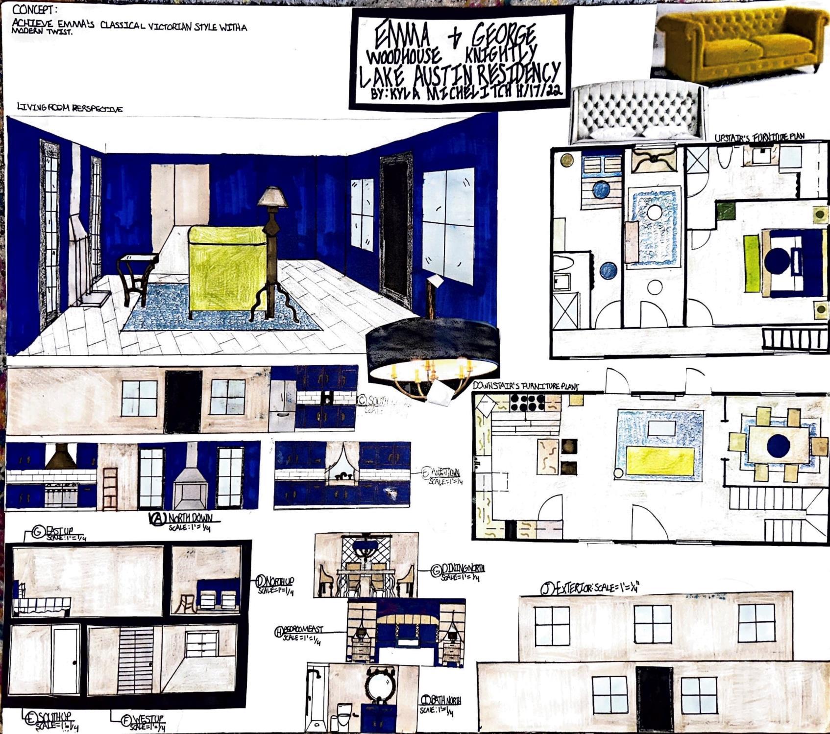 The Lake Austen project is a twostory shipping container home. It is an eco friendly home with a Victorian style that has a modern twist. The mandatory color palette of the house is inspired by navy blue, beige, and chartreuse.