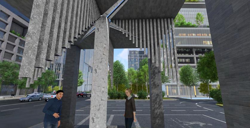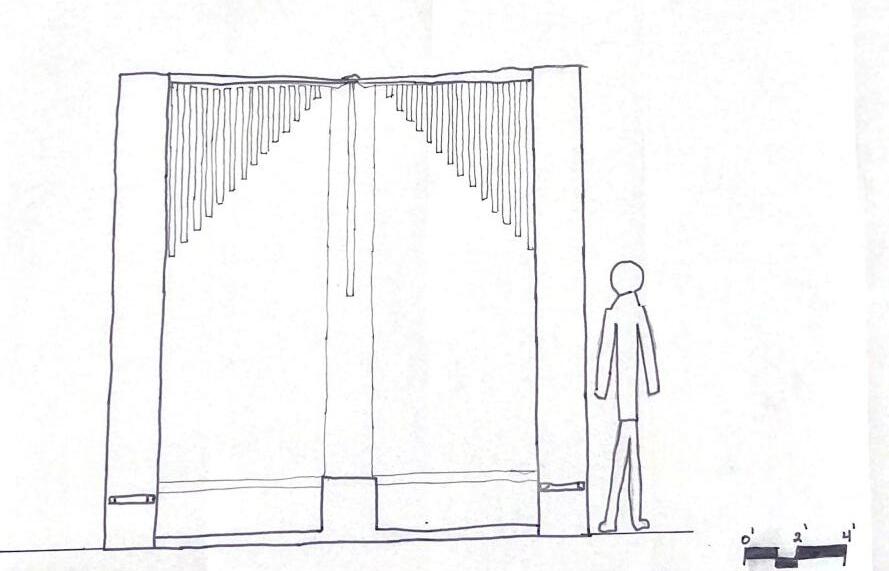 At rst glance. My space doesnt look like much other than some tubs of water and haning poles, but it is much more than that. Not only does it serve a function. It also allows one to be enhanced by the element water. Say youre walking home from work and it starts to rain. You spot my structure to your left and decide to stand under it to be covered from the rain. As the rain starts to pour down heavier, you notice that the water starts to pour into the tubs from the hanging tubes and a stream of water that forms a wall comes from the slits in the roof. Youre worried youll get wt but then realize that the tubs catch all the wayer. You peacefully listen to the rain ow through the structure while you wait for the rain to stop. when it nally stops, you walk away and look back and have a full understanding of the structures purpose