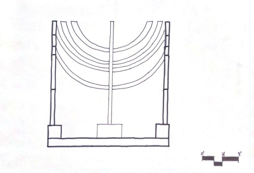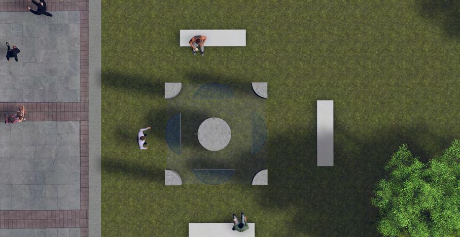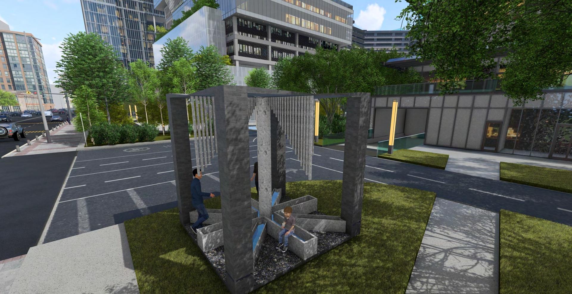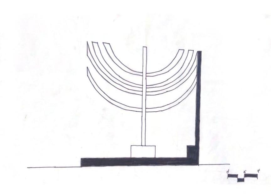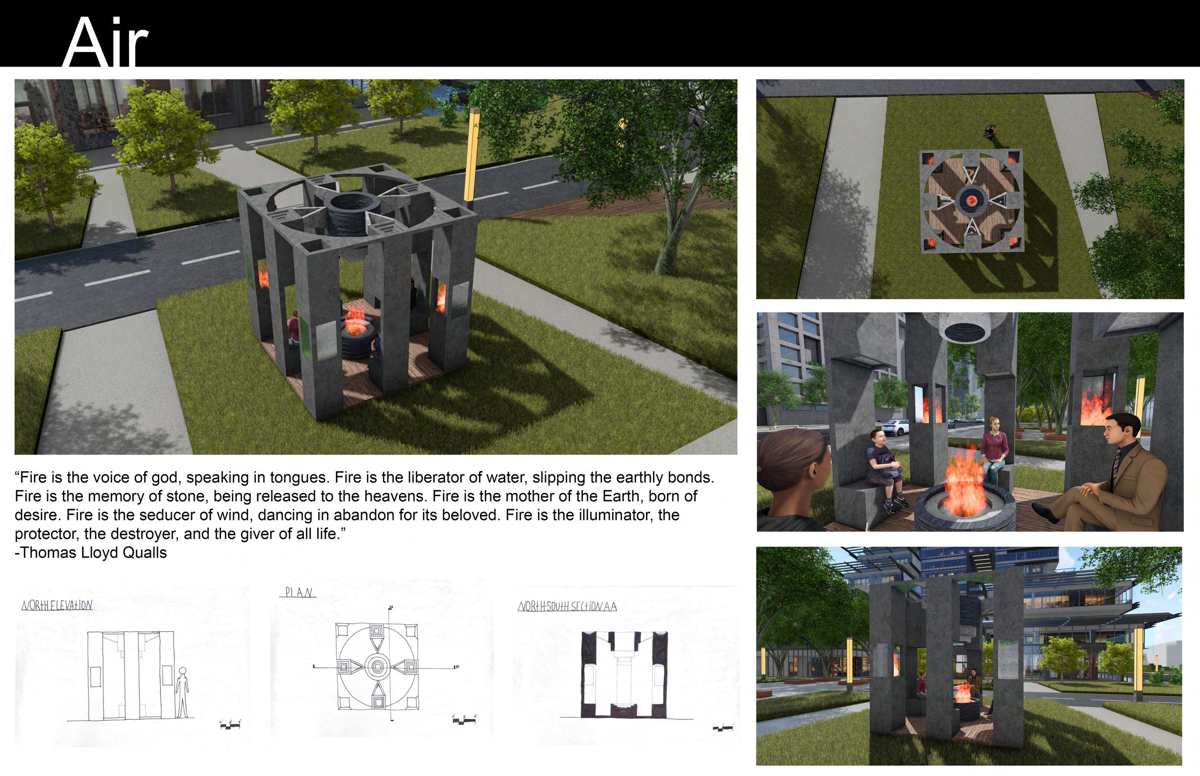 In nature, interacting with the elements often allow you to feel a sense of connection with it. My structure allows one to enjoy the element of wind by feeling the breeze and watching the ceneter-piece (dreidel) spin. The translucent pillars in the cardinal directions allow the audience to see the spinning dreidel from anywhere they want to stand.