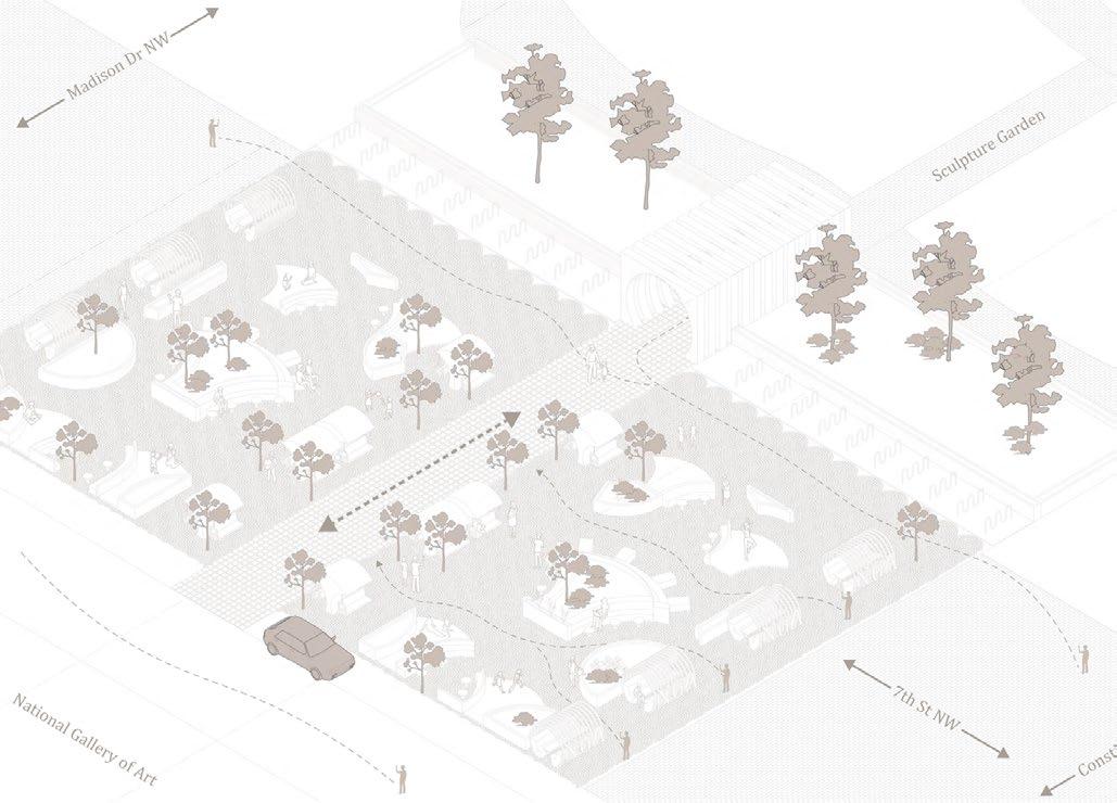 Designed in collaboration with Ella Kuehnert, “The Yard” is an addition to the National Gallery of Art’s Sculpture Garden. The problems that are addressed in this design include: creating more seating to accomodate a variety of group sizes, increasing the NGA brand identity, and creating a distinguished grand entrance. The key considerations in this landscape design are accessibility and creating a feature that attracts passers-by to the plaza and, subsequently, to the NGA.