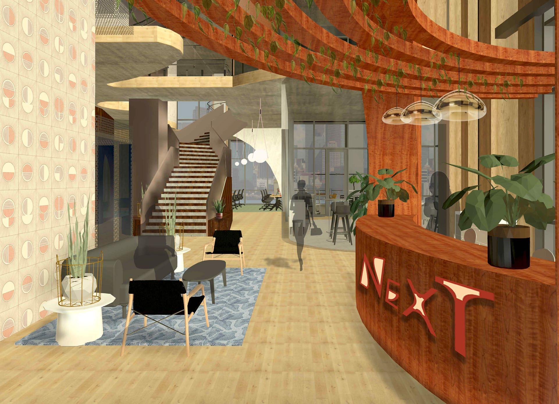 NEXT is an office design for a corporate architecture firm. This design aims to combat traditional office geometries and motifs by using warp and skew as the guiding concept. The traditional office geometries are warped by introducing a skewed perception of scale and forcing architectural elements to become secondary. Users experience unexpected moments while traversing the office and, in turn, find inspiration for dynamic ideas in their own work. This office design accommodates 50+ employees.