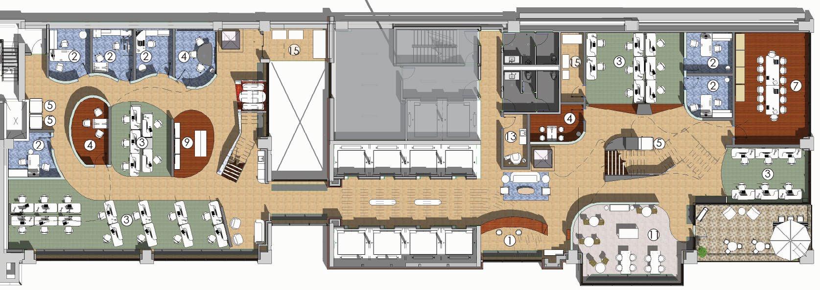 The interaction between skewed and warped features in the space create the dynamisim that will, in turn, lead to the new experience that this corporate client is seeking out for their new office.
