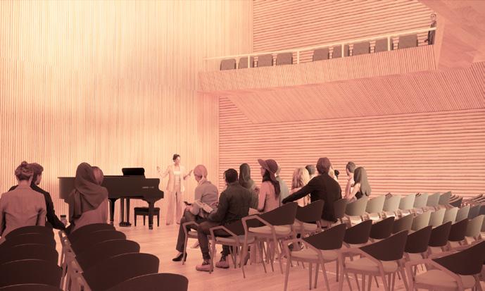 Because of the public nature of the space, the urban context and surrounding site played an incredibly important role in the concepts and design of this concert hall. The site for this project was located in the West Loop, near Greektown, at the corner of West Jackson Boulevard and South Green Street, currently infrequently used parking lot. To the west, there was a lot of residential development, particularly in young couples, around the ages of 25-35. To the east is Greektown, with many cultural art pieces and dining places. Thus, this site was positioned in a transition zone, easily walkable between the residential spaces and the nearby restaurant hub on Halsted. Additionally, there was a great lack of public spaces in the area, which was part of the inspiration to make this a recognizable cultural and public center for the community.