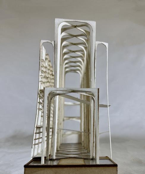 The main atrium space is divided in five parts, in a 1:3:1 ratio. The smaller (flying buttresse-esque) forms flank the larger and slightly taller arched forms in the center. The intersection of the center supports with the side supports forms a point of structural support for the ramps moving up the side of the building.