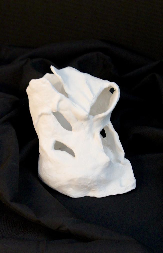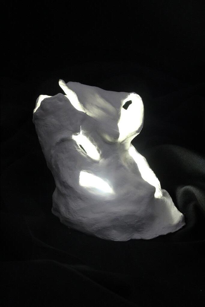 The medium of this light is clay, with an inner support structure of wire mesh - choosing the combination of these two materials both made the light structurally sound, while being warped and bent. This light was created as a free-form design, so there wasn't a fullzy drawn out plan when the construction began. Leading to the creation of a structure unique in form, resembling that of a worn out boot.