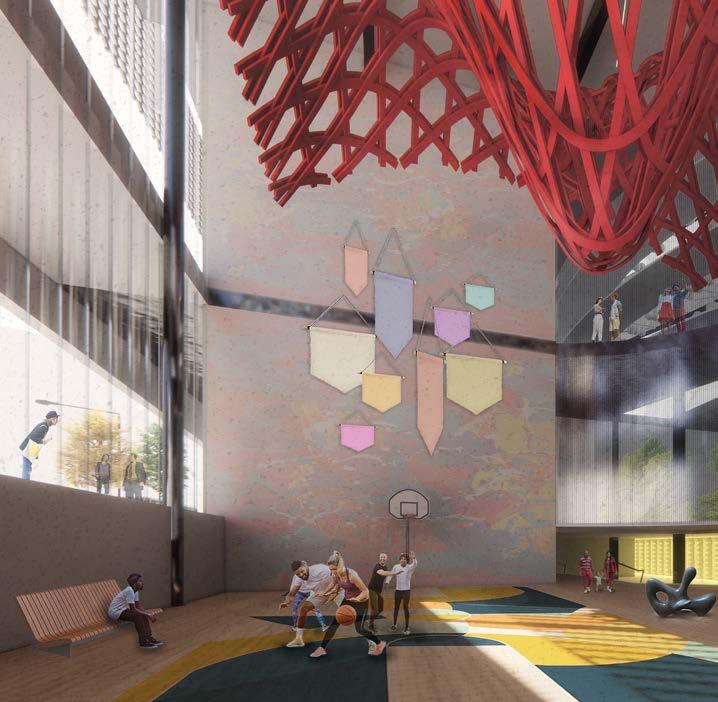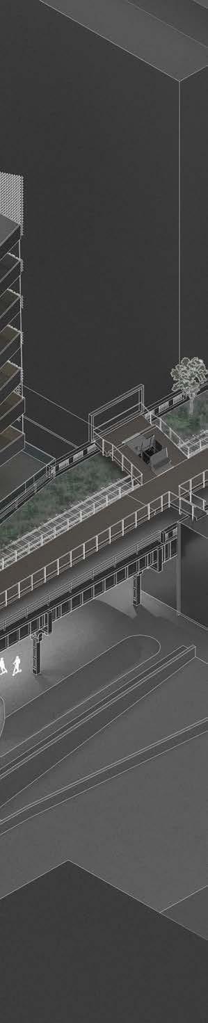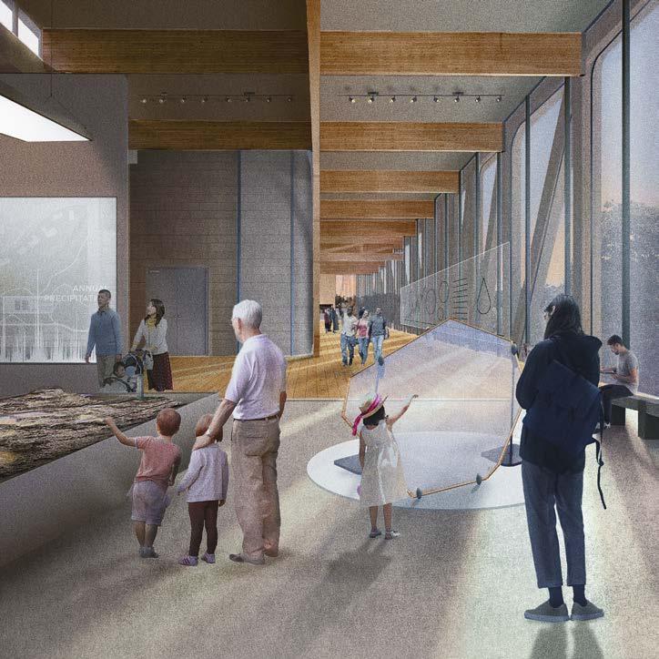 BIORETENTION CELL Runoff from surrounding impervious surfaces collects in a pond where aquatic species and understory plant life filter pollutants before returning to groundwater and streams OBSERVABLE MEP SYSTEMS hydronic heating and cooling equipment including chillers and boilers are viewable to the public for better understanding of water-based themal comfort systems WOODLAND PATHS Permeable paver paths connect existing neighborhoods and cycle paths throughout the site, bringing visitors through existing woodlands towards the center VERTICAL CIRCULATION Egress stairwells and elevator shafts connect the forest floor to the upper level while also concealing structural supports, mechanical systems, and back of house areas 0’ 50’ 25’ 12’ 1 1 2 2 3 3 4 4 4 6’ KYLE GUENTHER | 2023